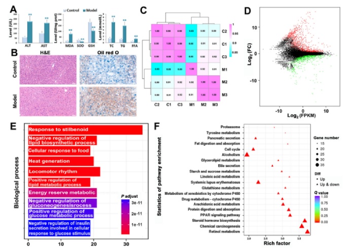 誘導(dǎo)小鼠發(fā)生NAFLD,結(jié)果顯示血清ALT、AST、TC、TG、FFA水平顯著升高;MDA、SOD和GSH水平的變化表明模型組小鼠肝臟的氧化應(yīng)激狀態(tài)(圖1A)。通過(guò)H&E染色和油紅O染色觀察模型組肝組織病理改變和脂質(zhì)堆積情況(圖1B)。