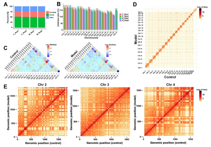 為了獲得三維染色質(zhì)構(gòu)象圖,作者對(duì)肝臟樣本的Hi-C文庫(kù)進(jìn)行了測(cè)序,每組總共獲得超過(guò)477 Gb的數(shù)據(jù)。在去除PCR重復(fù)位點(diǎn)后,每個(gè)樣本獲得了超過(guò)8.02億對(duì)有效Hi-C數(shù)據(jù),測(cè)序深度為68.56%和68.96%,能夠以10 kb分辨率檢查C組和M組的相互作用。順?lè)词较嗷プ饔玫谋壤@示,約四分之三的相互作用發(fā)生在染色體內(nèi),四分之一的相互作用發(fā)生在染色體間質(zhì)(圖2A)。,這個(gè)頻率可以揭示染色體在基因組中的相互作用強(qiáng)度和染色體在細(xì)胞核中的相對(duì)位置。染色體之間的相互作用頻率熱圖如圖2C所示。通過(guò)熱圖顏色由對(duì)照組的藍(lán)色變?yōu)镹AFLD組的淺紅色,可以發(fā)現(xiàn)染色體Chr2與Chr5之間相互作用頻率的差異,提示NAFLD組兩染色體之間距離較近,相互作用較強(qiáng)。相比之下,觀察到的顏色從紅色變?yōu)樗{(lán)色,表明NAFLD組染色體之間的空間距離更遠(yuǎn),相互作用更弱,如Chr 7和Chr 11之間的相互作用。將各組的兩個(gè)Hi-C庫(kù)結(jié)合起來(lái),進(jìn)行對(duì)照組與模型組的對(duì)比分析。根據(jù)任意兩個(gè)bin之間覆蓋的Hi-C讀對(duì)的歸一化相互作用信號(hào)強(qiáng)度,繪制全基因組相互作用矩陣(圖2D),染色體內(nèi)相互作用矩陣如圖所示。
