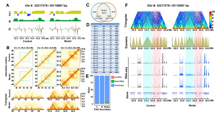 作者用TadLib軟件在20kb分辨率下識(shí)別TADs。在對(duì)照組和模型組TAD比較中,作者在對(duì)照組中發(fā)現(xiàn)了8179個(gè)TAD,在NAFLD組中發(fā)現(xiàn)了7818個(gè)TAD,其TAD大小中位數(shù)為180 kb。TAD結(jié)構(gòu)分析表明,TADs具有穩(wěn)定的染色質(zhì)結(jié)構(gòu)特征。方向性指數(shù)(DI)衡量了給定感興趣區(qū)域接觸方向的不平衡46,并與TAD邊界有關(guān),TAD邊界顯示出從上游到下游DI的強(qiáng)烈轉(zhuǎn)移特征(圖4A)。作者在對(duì)照組和NAFLD中分別識(shí)別出9390和9246個(gè)TAD邊界,其中538個(gè)為特殊控制邊界,394個(gè)為模型組邊界)。TADs在對(duì)照組和NAFLD組之間高度相關(guān),只有大約5%的TAD邊界在NAFLD發(fā)展過(guò)程中發(fā)生改變。TADs在基因表達(dá)調(diào)控中發(fā)揮重要作用,繪制了與差異TAD邊界相關(guān)的DEGs,并分析了它們的數(shù)量。圖4E所示為各組唯一TAD邊界及兩組不變邊界相關(guān)的deg。NAFLD的基因表達(dá)受到TAD邊界變化的影響,如圖4F中紅色陰影的染色體區(qū)域,以及圖4F中藍(lán)色陰影所示區(qū)域的交替。鑒定出42個(gè)上調(diào)基因和30個(gè)下調(diào)基因(支持信息圖S5和表S11)。這些結(jié)果表明,由于與NAFLD發(fā)展相關(guān)的新的TAD邊界的形成和消失,轉(zhuǎn)錄譜發(fā)生了改變。