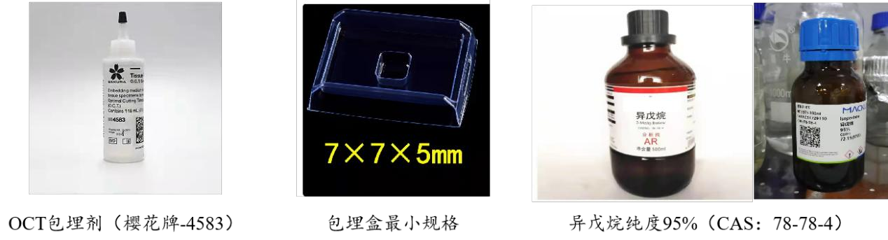 注:原則上實(shí)驗(yàn)室不提供組織冷凍包埋相關(guān)試劑,需客戶網(wǎng)上自行購(gòu)買,如有需要請(qǐng)聯(lián)系運(yùn)營(yíng)確認(rèn)實(shí)驗(yàn)室是否有存貨,因 OCT 試劑無法分裝運(yùn)送,實(shí)驗(yàn)室也僅僅可提供包埋盒。