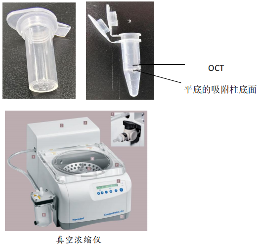 3)冰上預(yù)冷75% OCT包埋劑溶液(5mlOCT+2.5ml滅菌水顛倒混勻),1.5ml離心管中加入1ml 75%OCT,將植物組織浸潤(rùn)在其中,將平底的無吸附膜的吸附柱放入1.5ml離心管中,以防止抽真空過程組織上浮在OCT表面,打開所有管蓋,置于真空濃縮儀中(注意配平)。室溫抽真空10min,摸索設(shè)置成V-AQ,促進(jìn)OCT溶液充分包裹和進(jìn)入組織空隙中,保證OCT填充包埋組織的完整性。如下圖: