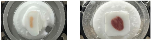 6)將包含組織和OCT的包埋盒放在干冰粒上輕輕按壓(如下圖,左),確保水平(否則會(huì)影響組織的方向,同時(shí)能保證干冰粒與包埋塊的接觸面積最大以達(dá)到快速降溫的效果),直到包埋塊完全凍結(jié)變白(如下圖,右)。
