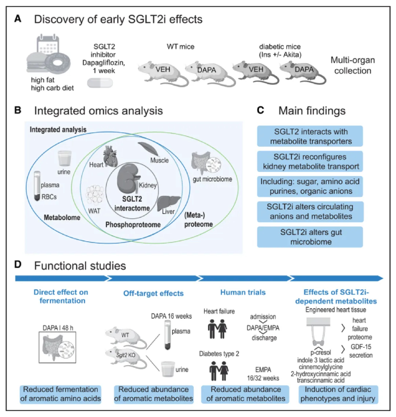 丹麥奧胡斯大學(xué)學(xué)者在Circulation雜志上發(fā)表題為“Metabolic Communication by SGLT2 Inhibition“研究論文,研究團隊使用Akita小鼠模型和臨床隊列樣品,通過整合宏基因組、代謝組、蛋白組等多組學(xué)數(shù)據(jù),確定了SGLT2i對腎臟、心臟、血管和其他器官的幾種SGLT2依賴性效應(yīng)和脫靶效應(yīng),通過重構(gòu)腎臟代謝物轉(zhuǎn)運和全身代謝通訊,發(fā)揮心腎保護作用。提供了關(guān)于SGLT2相互作用因子和SGLT2i依賴性蛋白質(zhì)組、代謝組、磷酸化蛋白質(zhì)組和宏蛋白質(zhì)組的新見解,從而為SGLT2i新型和早期機制靶標(biāo)提供了潛在的路線,促進代謝藥物的開發(fā)。
