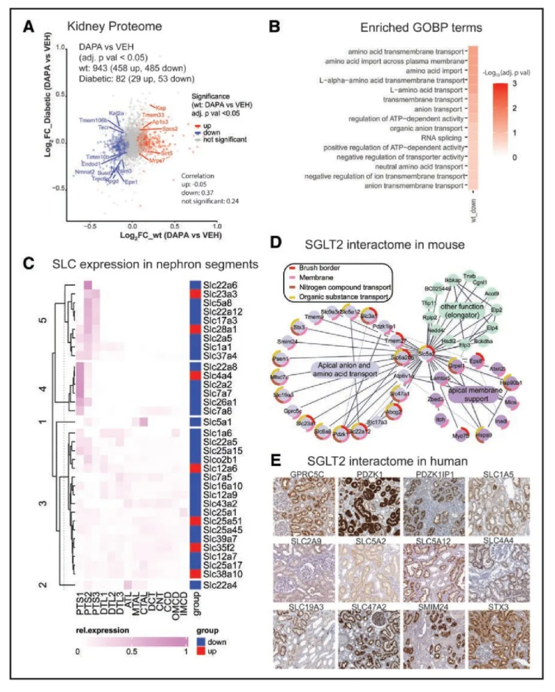 圖2-綜合蛋白質(zhì)組/相互作用組分析表明SGLT2i對腎臟代謝產(chǎn)物轉(zhuǎn)運的廣泛重塑
