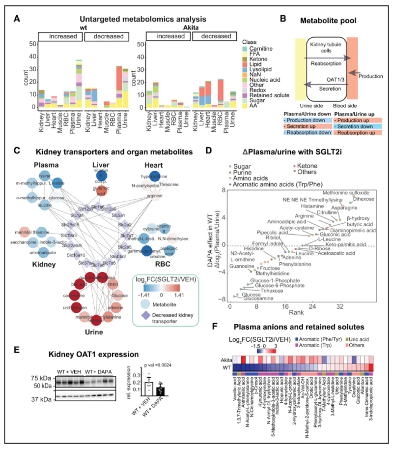 SGLT2抑制劑(SGLT2i)改變了腎蛋白質(zhì)組和磷酸蛋白質(zhì)組,同時調(diào)控其他代謝物轉(zhuǎn)運蛋白。其抑制作用引起了血漿和尿液代謝物的顯著變化。因此,研究者提出腎蛋白質(zhì)組的重編程可能部分解釋了觀察到的代謝物變化。文章中指出了可能影響體液循環(huán)代謝物組成的多個過程,包括尿液排泄的改變(圖3B)。在WT小鼠中,SGLT2i在腎臟中減少了27種SLC的表達。結(jié)合這些結(jié)果和尿液代謝譜,表明了SGLT2i可能通過影響其他器官的代謝物組成,從而導(dǎo)致尿液中代謝物的變化(圖3C)。