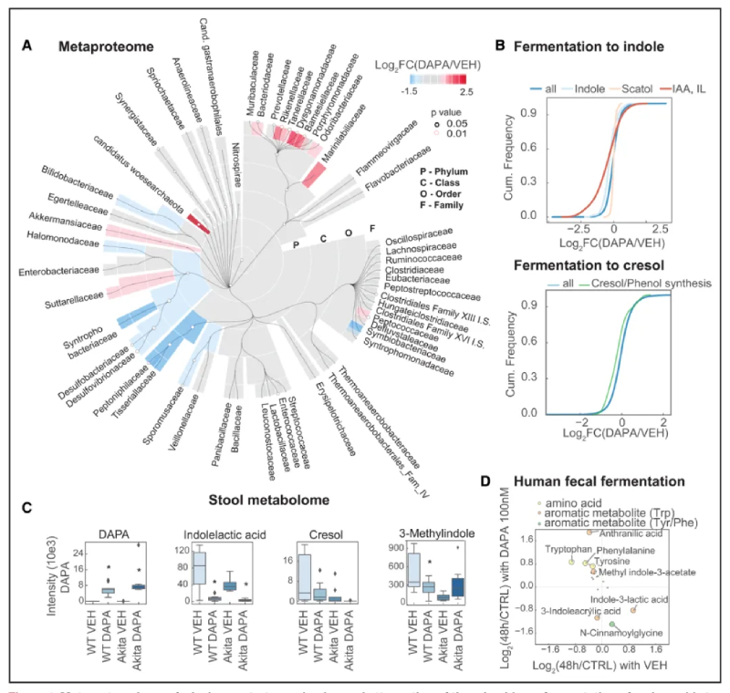 使用苯丙氨酸等芳香族氨基酸作為底物可以減少甲酚和苯酚的生成劑(圖4B)。糞便代謝組檢測表明顯示糞便中存在達格列凈(圖4C)。在達格列凈治療小鼠的這些糞便樣本中,色氨酸和苯丙氨酸發(fā)酵的代謝物有所減少(圖4C)。為了探究達格列凈在糞便中的直接作用,將SGLT2i添加到人糞便中。厭氧發(fā)酵后,發(fā)現(xiàn)吲哚乳酸、色氨酸代謝物和肉桂酰甘氨酸減少(圖4D);也就是說,與WT小鼠血漿中SGLT2i 減少的化合物相關(guān)的化合物(圖3F)。在人體糞便發(fā)酵中添加SGLT2i也逆轉(zhuǎn)了這些毒素母體分子的消失,特別是芳香族氨基酸色氨酸、酪氨酸和苯丙氨酸(圖4D)。