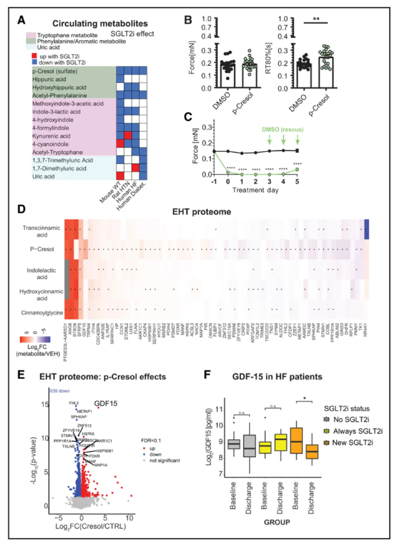 為了進一步闡明該機制,對用300μM PCL、吲哚乳酸和3種其他芳香族代謝物處理的 EHT 組織進行了蛋白質(zhì)組學(xué)分析(圖7D)。觀察到最強烈的變化是 PCL 的反應(yīng)(圖7D)。多種蛋白質(zhì)的增加包括心臟病相關(guān)通道TRPM4、 FLNA和生長因子CCN1;減少的蛋白質(zhì)包括 PPP1R1A,其下調(diào)已被報道為人類HF的標(biāo)志。PCL改變的蛋白質(zhì)組的一個獨特特征是心臟肌節(jié)相關(guān)蛋白的減少(圖S7D),以及應(yīng)激信號 GDF15的強烈感應(yīng)(圖7E)??紤]到HF患者中該通路的調(diào)節(jié),檢測了GDF15 水平,發(fā)現(xiàn)接受SGLT2i治療心力衰竭的患者循環(huán) GDF15 減少(圖7F)。