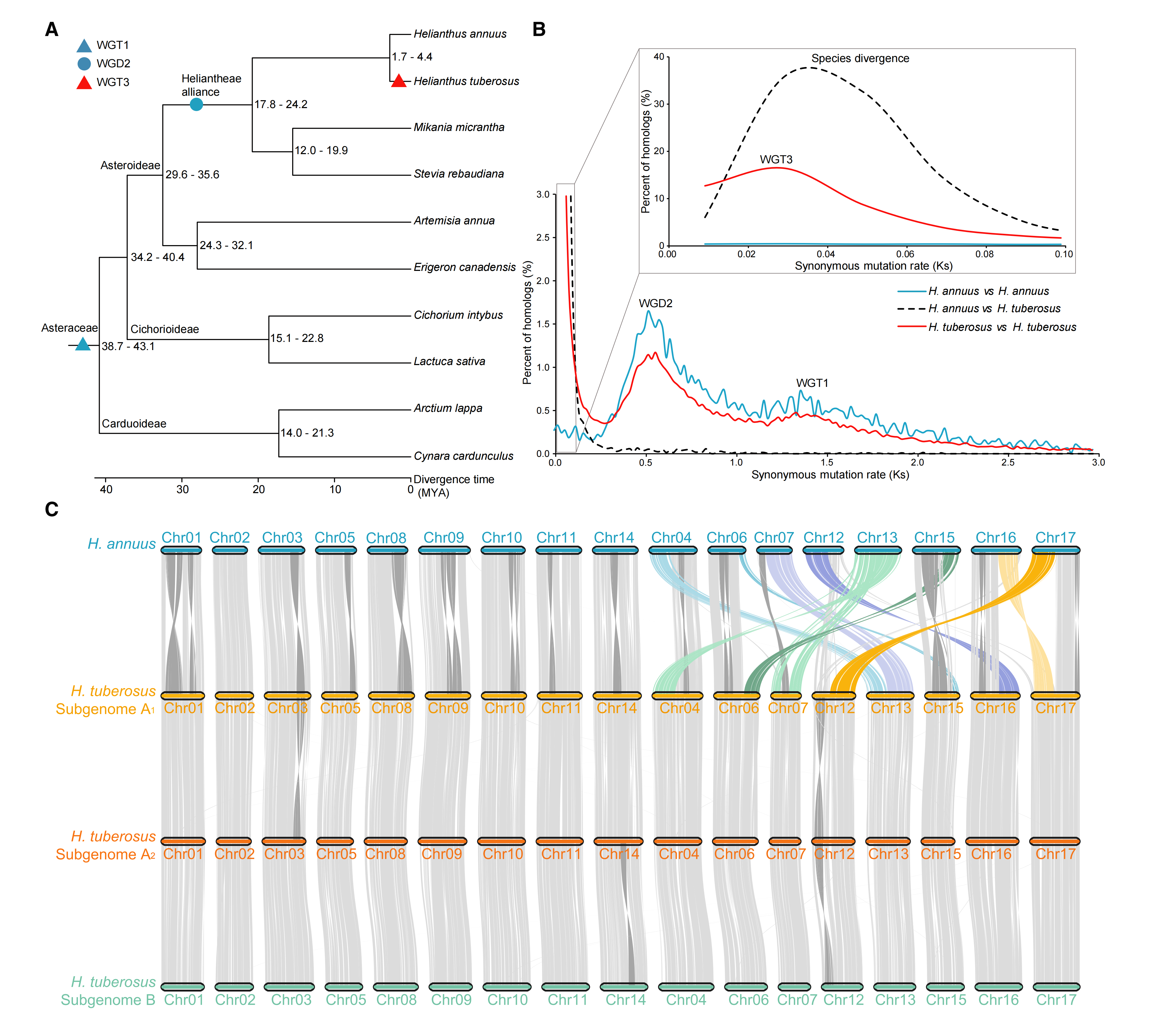 今天的菊芋基因組經(jīng)歷了約4500萬年前菊科祖先發(fā)生的全基因組三倍化,約2900萬年前向日葵超族祖先發(fā)生的全基因組加倍,以及約2百萬年前菊芋與向日葵分化后發(fā)生的全基因組三倍化事件。同源染色體單拷貝直系同源基因的進化分析表明,最近的三倍化是菊芋二倍體與四倍體祖先發(fā)生的種間雜交和染色體加倍事件,故菊芋基因組包含了A1, A2、B三個亞基因組。除基因組多倍化事件外,向日葵屬內(nèi)大規(guī)模染色體重排、轉(zhuǎn)座子活動、基因突變和人工馴化選擇等過程共同塑造了現(xiàn)在的六倍體菊芋基因組。