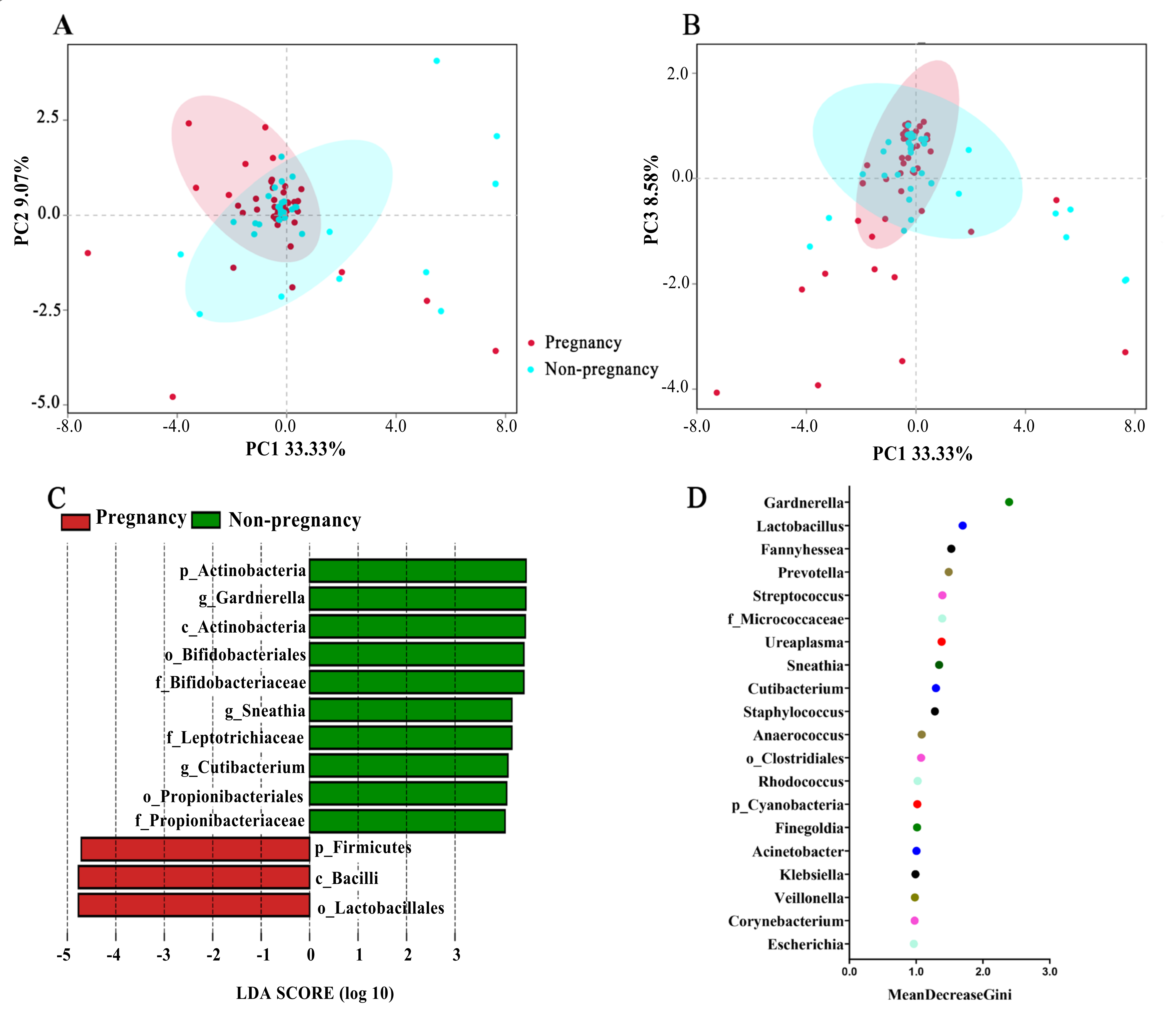 對陰道拭子進行微生物多樣性測序分析。結(jié)果表明,在屬水平上,豐度最高的最常見細菌是Lactobacilli、Gardnerella(8.57%)、Streptococcus?(1.79%)和Atopobium(1.54%)。PCoA顯示這兩組的陰道微生物群落結(jié)構(gòu)略有不同;Lefse分析表明,妊娠組乳乳酸桿菌(Lactobacillus)豐度高于非妊娠組。非妊娠組中放線菌門和加德納菌屬的豐度高于妊娠組。在屬水平上,潛在生物標志物包括?Gardnerella、Lactobacil-lus和Fannyhessea,(圖2D)。妊娠組加德納菌的相對豐度顯著低于未妊娠組。