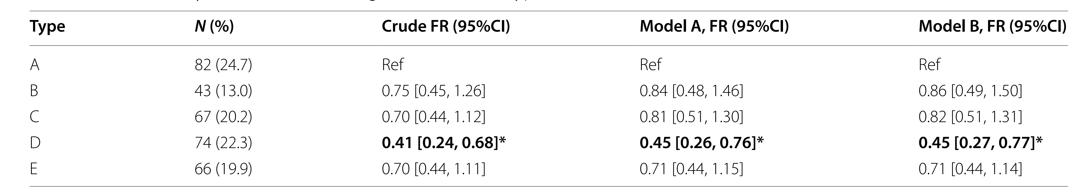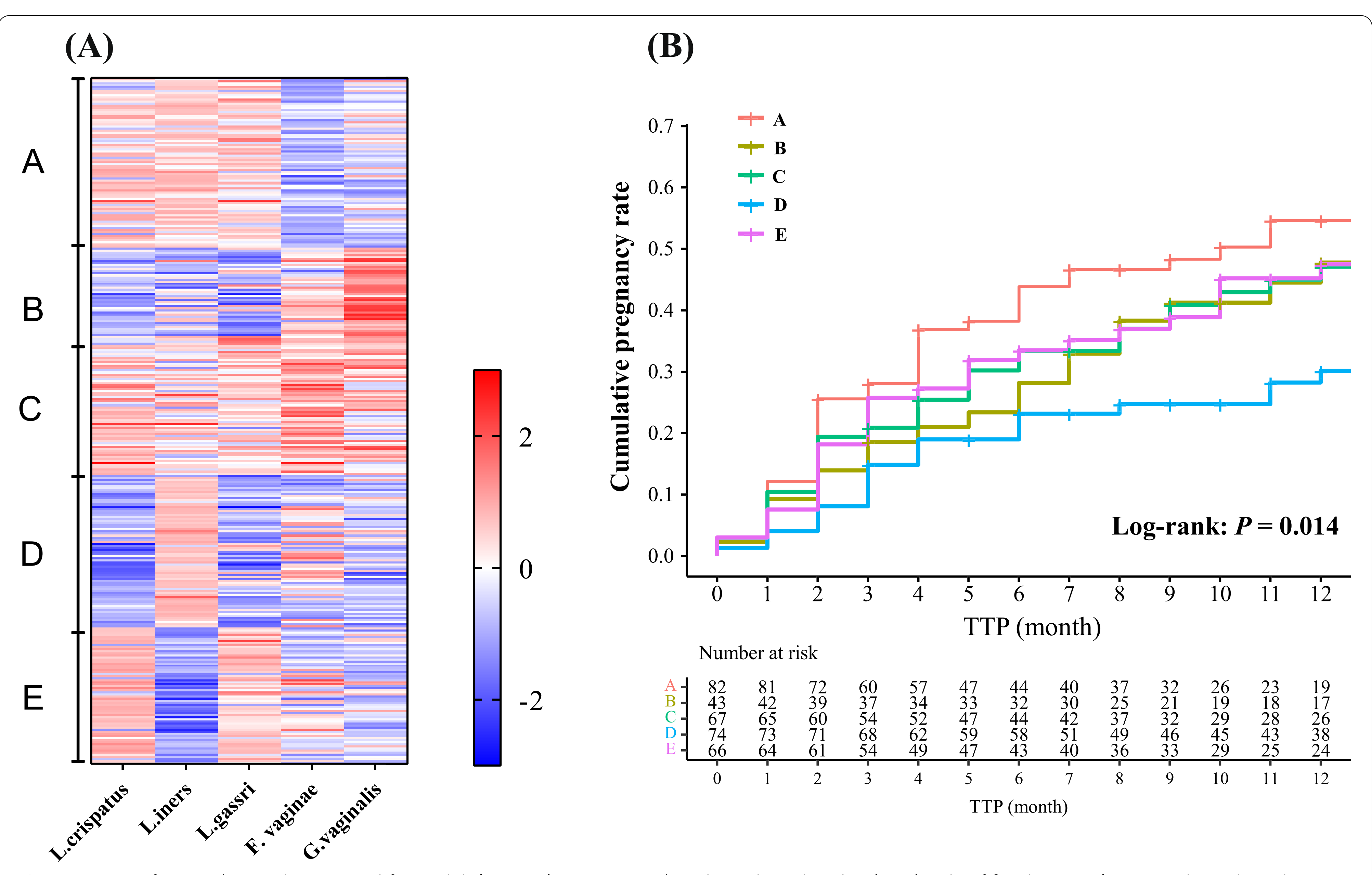 根據(jù)五種細菌的絕對負荷量,發(fā)現(xiàn)陰道微生物群聚為五種類型(A-E)。圖4A顯示A型(24.7%,82/332)以三種高豐度乳桿菌和低豐度的G.vaginalis和F.vaginae為特征。B型(13.0%,43/332)表現(xiàn)為G.vaginalis高豐度,三種乳桿菌豐度低。C型(20.2%,67/332)以高豐度F.vaginae為主和適度豐富的三種乳桿菌。D型(22.3%,74/332)的特征是Liners豐度較高,其余4種豐度較低。E型(19.9%,66/332)表現(xiàn)為L. crispatus和L.gasseri豐度較高,其他三種豐度較低。圖4B顯示,具有不同類型陰道微生物群的婦女具有不同的生育能力。A型陰道微生物組的累積妊娠率最高,而D型陰道微生物組的累積妊娠率最低。B型、C型和E型的累積妊娠率相似。