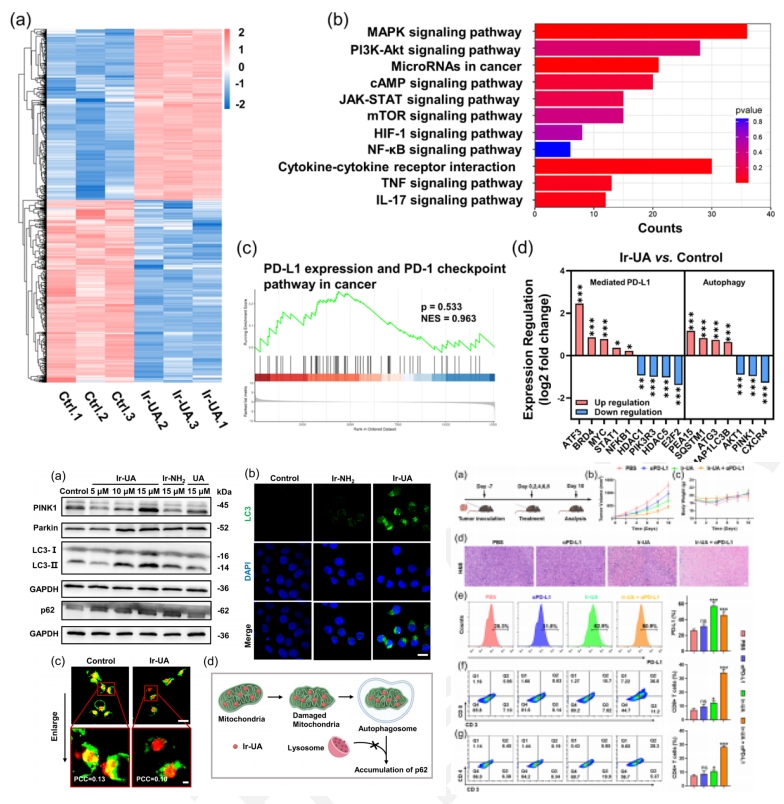 這些結(jié)果表明,Ir-UA不僅抑制OXPHOS,還抑制糖酵解,從而切斷它們之間的轉(zhuǎn)換,最終導(dǎo)致細(xì)胞死亡。結(jié)合WB結(jié)果,該研究證實(shí)了Ir-UA可以阻斷A549細(xì)胞的自噬,誘導(dǎo)p62的積累,從而可能促進(jìn)PD-L1的表達(dá)。結(jié)合RNA-seq結(jié)果中PD-L1相關(guān)基因表達(dá)水平變化和自噬阻斷的變化,作者綜合了免疫印跡及流式細(xì)胞術(shù)的結(jié)果,表明Ir-UA可誘導(dǎo)腫瘤細(xì)胞中PD-L1的高表達(dá),這可能是由自噬阻斷和ATF3上調(diào)的協(xié)同作用引起的,有望導(dǎo)致“冷腫瘤”向“熱腫瘤”的過渡。之后,該研究在皮下移植的LLC細(xì)胞腫瘤小鼠模型中驗(yàn)證了其抗腫瘤效果,證實(shí),Ir-UA和αPD-L1聯(lián)合使用可顯著抑制具有良好生物安全性的小鼠體內(nèi)腫瘤的生長。