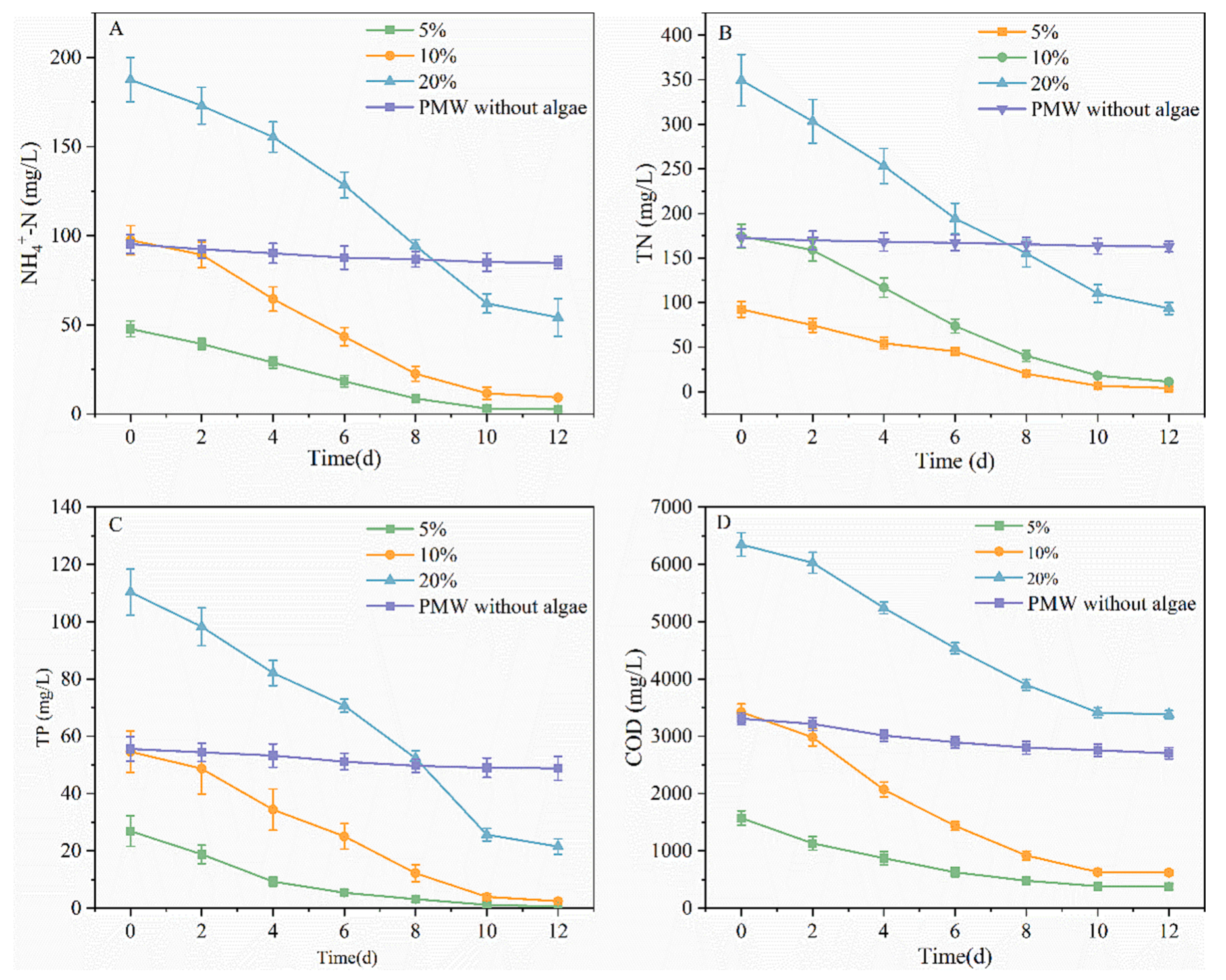 結(jié)果顯示,經(jīng)過(guò)12天的處理,原生微生物在10%的PMW中分別去除了6%、11%、12%和18%的TN、NH4+-N、總磷和COD(圖1)。這表明,雖然PMW中存在的原生細(xì)菌促進(jìn)了營(yíng)養(yǎng)物質(zhì)的去除,但硅藻在處理原料PMW中發(fā)揮了主要作用。根據(jù)上述結(jié)果和PMW的排放標(biāo)準(zhǔn),確定了10%的PMW是通過(guò)C. muelleri和細(xì)菌培養(yǎng)對(duì)PMW進(jìn)行生物修復(fù)的最適宜濃度。