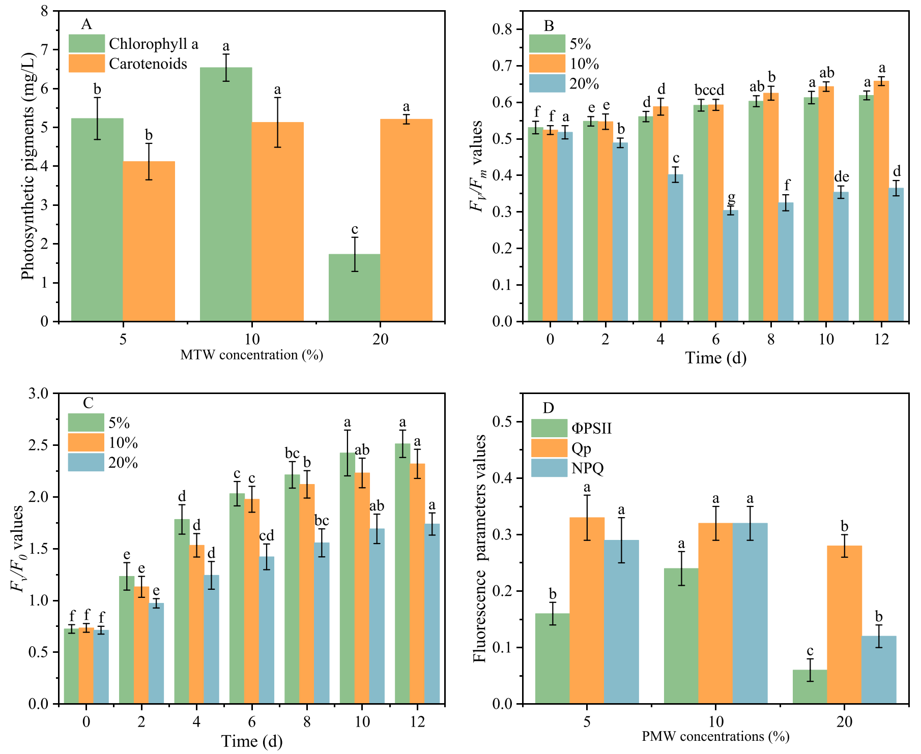 Fv/Fm檢測(cè)可以快速評(píng)價(jià)微藻對(duì)生長(zhǎng)環(huán)境的適應(yīng)性。隨著PMW濃度的增加,在圖2B中,在第12天,10% PMW的Fv/Fm最高(0.658)。與未添加PMW相比,5% PMW、10% PMW和20% PMW的Fv/Fm分別降低了8%、2%和46%。這表明藻類(lèi)的能量轉(zhuǎn)化率降低,對(duì)微藻的光合作用有一定的抑制作用。在20%的PMW中,F(xiàn)v/Fm值恢復(fù),表明C. muelleri對(duì)不利環(huán)境產(chǎn)生了特異性抗性。Fv/F0可用于確定植物的光合效率和生理狀態(tài)。Fv/F0的下降(圖2C)表明C. muelleri供體側(cè)的水分裂復(fù)合物崩潰,導(dǎo)致電子傳遞能力下降。有效量子產(chǎn)率(ΦPSII)可以揭示微藻在不同環(huán)境條件下的生理狀態(tài)和PSII的性能。5%、10%和20% PMW組C. muelleri的ΦPSII分別為0.16、0.24和0.06(圖2D)??傮w而言,10% PMW處理下C. muelleri的光合效率最好,這也有利于PMW處理。