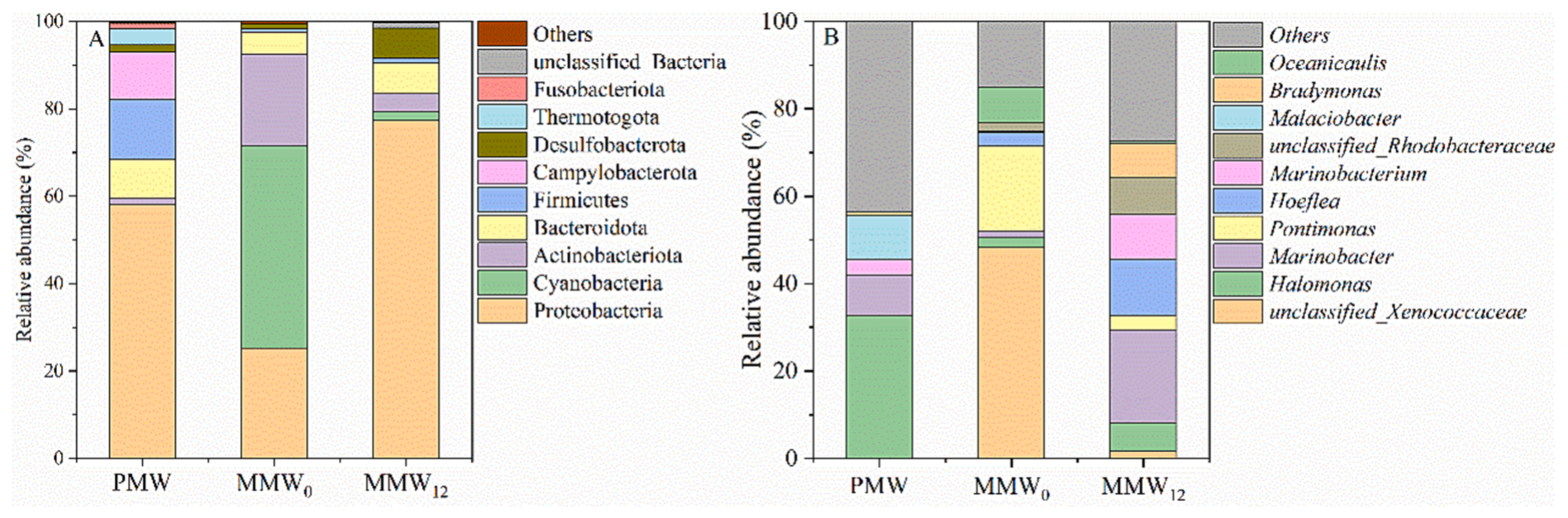 為了進(jìn)一步明確細(xì)菌在系統(tǒng)中的作用,在門(mén)和屬水平上的10個(gè)優(yōu)勢(shì)分類(lèi)群如圖5A和5B所示。Proteobacteria豐度在PMW中達(dá)到58%,與C. muelleri在MMW12共培養(yǎng)條件下增加到77%。變形桿菌中含有多種促進(jìn)氮轉(zhuǎn)化和有機(jī)物降解的功能菌株。此外,與PMW相比,MMW12組放線(xiàn)菌和藍(lán)藻菌的豐度也有所增加。