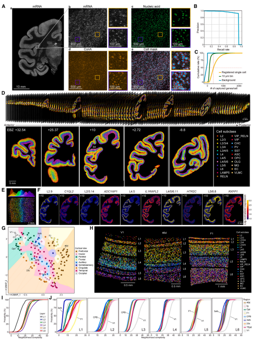 取樣策略:每隔500 μm取一次:包含兩個50 μm的大腦樣品切片進行snRNA-seq+一張10 μm切片進行空間轉錄組+兩張臨片切片進行尼氏染色。獼猴#1 119張切片、獼猴#2 19張切片、獼猴#3 23張切片,共161張進行空間轉錄組闡明大腦皮層的細胞組織是理解大腦結構和功能的關鍵。在本研究中,研究人員利用大規(guī)模單核RNA測序和143個獼猴皮質區(qū)域的空間轉錄組學分析,獲得了264種轉錄組定義的皮質細胞類型的綜合圖譜,并繪制了它們在整個皮質的空間分布。表征了谷氨酸能、氨基丁酸能和非神經元細胞類型的皮質層和區(qū)域偏好,以及細胞類型組成和“鄰域復雜性”的區(qū)域差異。值得注意的是,研究人員發(fā)現(xiàn)了視覺和體感系統(tǒng)中各種細胞類型的區(qū)域分布與區(qū)域等級水平之間的關系。來自人類、獼猴和小鼠皮層的轉錄組學數據的跨物種比較進一步揭示了靈長類特異性細胞類型在第4層富集,其標記基因以區(qū)域依賴的方式表達。該研究數據為理解靈長類動物大腦的進化、發(fā)育、衰老和發(fā)病機制提供了細胞和分子基礎。