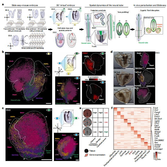 取樣策略:小鼠E8.5期胚胎:2個胚胎,15張10 μm切片,間隔30 μm;小鼠E9.0期胚胎:1個胚胎,26張10 μm切片,間隔20 μm;小鼠E9.5期胚胎:3個胚胎,13張10 μm切片在本研究中,研究人員使用Slide-seq技術構建了完整胚胎E8.5和E9.0以及部分E9.5胚胎的空間轉錄組圖譜。為了支持該項研究的應用,研究人員開發(fā)了sc3D——一個重建和探索三維“虛擬胚胎”的工具,它可以定量研究區(qū)域化的基因表達模式。發(fā)育中的神經管主胚軸的測量揭示了幾個以前未注釋的基因具有不同的空間模式。文章還描述了Tbx6突變胚胎中出現(xiàn)的“異位”神經管的相互沖突的轉錄特性。綜上所述,文章提出了一個用于整個胚胎結構和突變表型時空研究的實驗和計算框架。