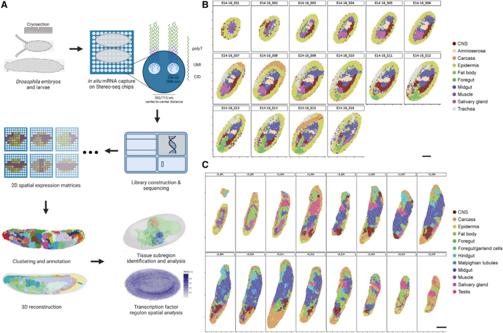 利用時空組學技術成功構建了果蠅胚胎和幼蟲的三維空間轉錄組圖譜。借助數據三維重構,確定了果蠅晚期胚胎和幼蟲中腸的功能亞區(qū),發(fā)現(xiàn)幼蟲精巢的時空細胞狀態(tài)動力學變化,并揭示了已知和潛在的轉錄因子在三維空間中的調控機制。這些研究和發(fā)現(xiàn)提供了全面詳實的數據和信息資源,為深入和系統(tǒng)進行果蠅發(fā)育生物學研究奠定基礎。