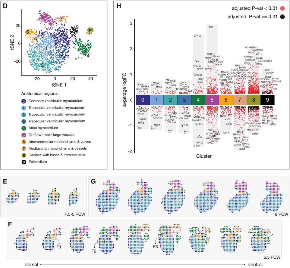 取樣策略:4.5-5 PCW 4張切片,6.5 PCW 9張切片,9 PCW 6張切片,合計19張切片文章構建了單細胞時空水平的發(fā)育中器官的3D轉錄圖譜,這種多轉錄組測序方法可以應用于其他器官發(fā)育的研究中。這一突破性研究使探索組織的整體空間轉錄模式成為可能,探索細胞異質性,并選擇性地靶向一些表達模式具有空間異質性且造成細胞類型差異的關鍵基因。心臟發(fā)育模型表明,空間、時間信息與單細胞基因表達數據的整合對于識別細胞類型之間的關鍵差異、深入分析發(fā)育中的組織是至關重要的。