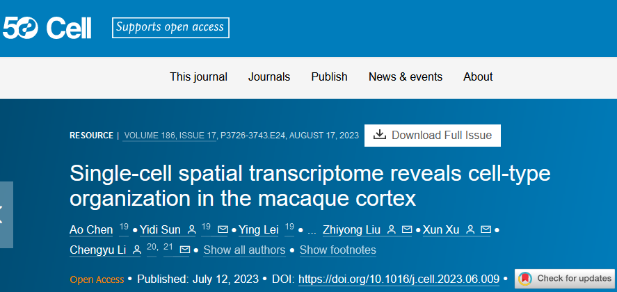 英文標題:Single-cell spatial transcriptome reveals cell-type organization in the macaque cortex