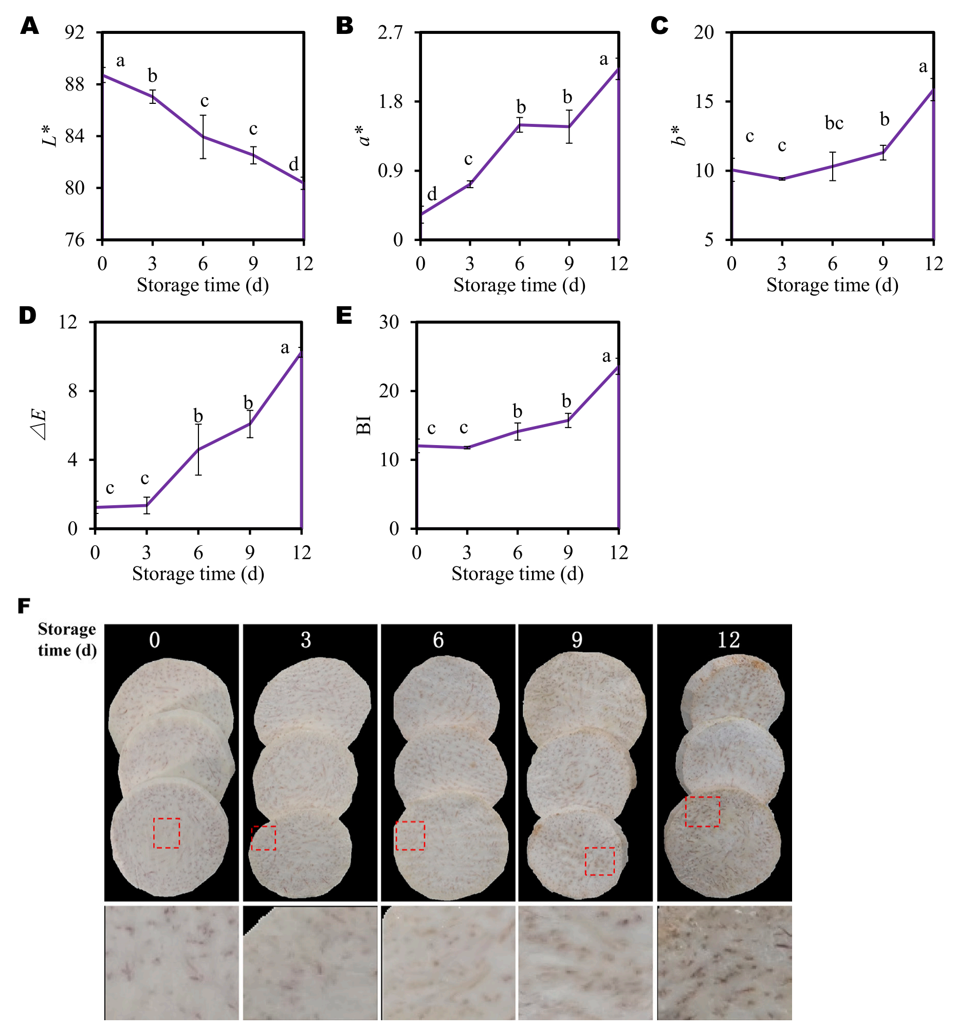 芋片切面顏色隨貯藏時(shí)間的變化如圖1A所示。切面L*值從0 d時(shí)的88.72下降到12 d時(shí)的80.36,冷藏12 d后L*值下降了9%(圖1A)。芋頭切片表面的a*、b*、△E和BI值在冷藏過(guò)程中也表現(xiàn)出類(lèi)似的變化趨勢(shì)(圖1B-E)。這些褐變指標(biāo)隨著貯藏時(shí)間的延長(zhǎng)而增加。冷藏12 d后,a*、b*、△E和BI值分別比0 d增加了582%、58%、725%和19%(圖1B-E)。宏觀褐變癥狀在第6天首次出現(xiàn),并在隨后的儲(chǔ)存過(guò)程中逐漸加劇(圖1F)。綜上所述,這些結(jié)果表明,即使在低溫(4℃)條件下,切片芋頭在儲(chǔ)存過(guò)程中也會(huì)發(fā)生褐變。