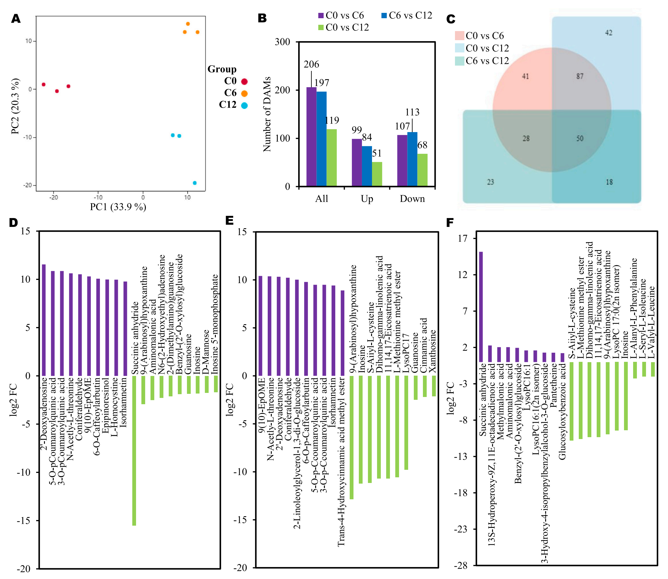 韋恩圖分析評(píng)估每個(gè)差異分組特有和共有的DAMs (圖2C)。圖2D-F展示了每個(gè)比較組中豐度增加和減少的top20的DAMs。C6組中10個(gè)代謝物豐度升高,如2′-脫氧腺苷、3-O-對(duì)香豆??鼘幩?、n -乙酰- l -蘇氨酸、松柏醛、9(10)-EpOME、6-O-咖啡酰丁醇、表肌醇、l -同型半胱氨酸、5-O-對(duì)香豆酰奎寧酸、異鼠李素。相反,琥珀酸酐、9-(阿拉伯糖基)次黃嘌呤、氨基丙酸、N6-(2-羥乙基)腺苷、2-(二甲氨基)鳥(niǎo)苷、芐基-(2 ‘-O-木糖基)葡萄糖苷、鳥(niǎo)苷、肌苷、D-甘露糖和肌苷5 ‘ -單磷酸在C6組中的豐度較低(圖2D)。