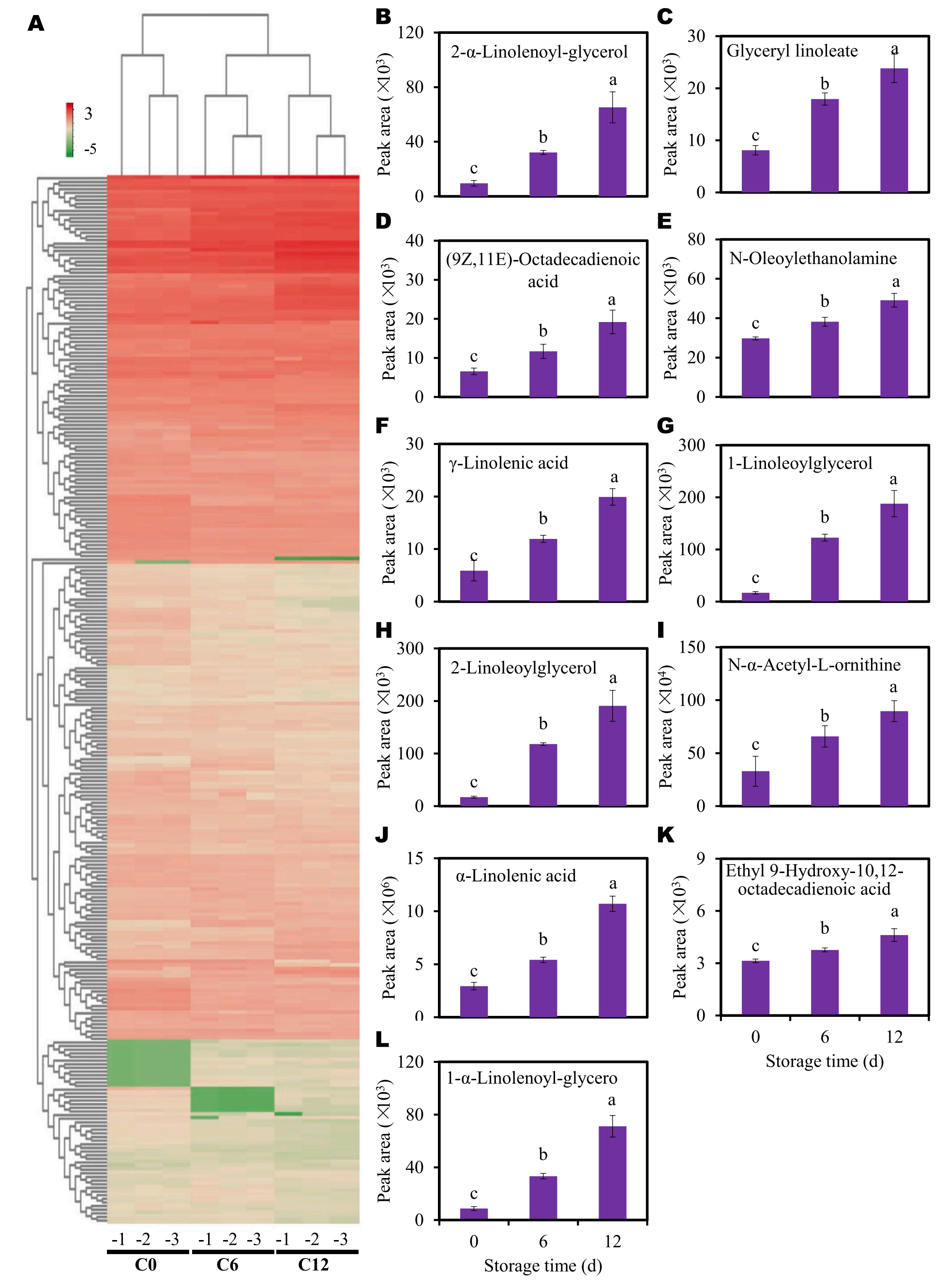 在C0和C12中,9(10)- epOME、n -乙酰- L-蘇氨酸、2 ‘ -脫氧腺苷、5- O -對(duì)香豆?;鼘幩?、2-亞麻油基甘油-1,3-二- O -糖苷、松木醛、6- O -對(duì)咖啡酰基熊果甙、異鼠李素、3-O-對(duì)香豆?;鼘幩岷头词?4-羥基肉桂酸甲酯在C12組中含量較高。相反,9-(阿拉伯糖基)次黃嘌呤、肌苷、S – aiiyl -L -半胱氨酸、8,11,14-二十烷三烯酸甲酯、L-蛋氨酸甲酯、LysoPC17:0、鳥(niǎo)苷、肉桂酸、11、14、17-二十碳三烯酸和黃嘌呤在C0組中表現(xiàn)出更高的豐度(圖2F)。