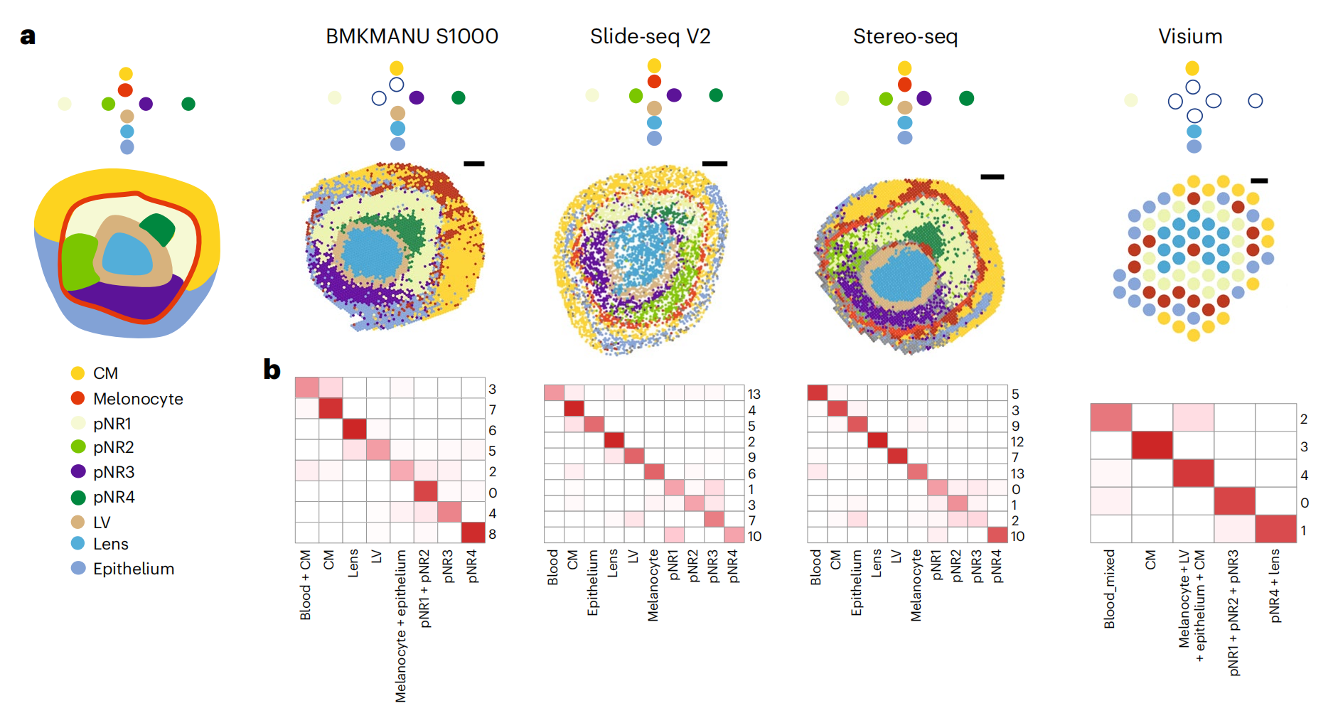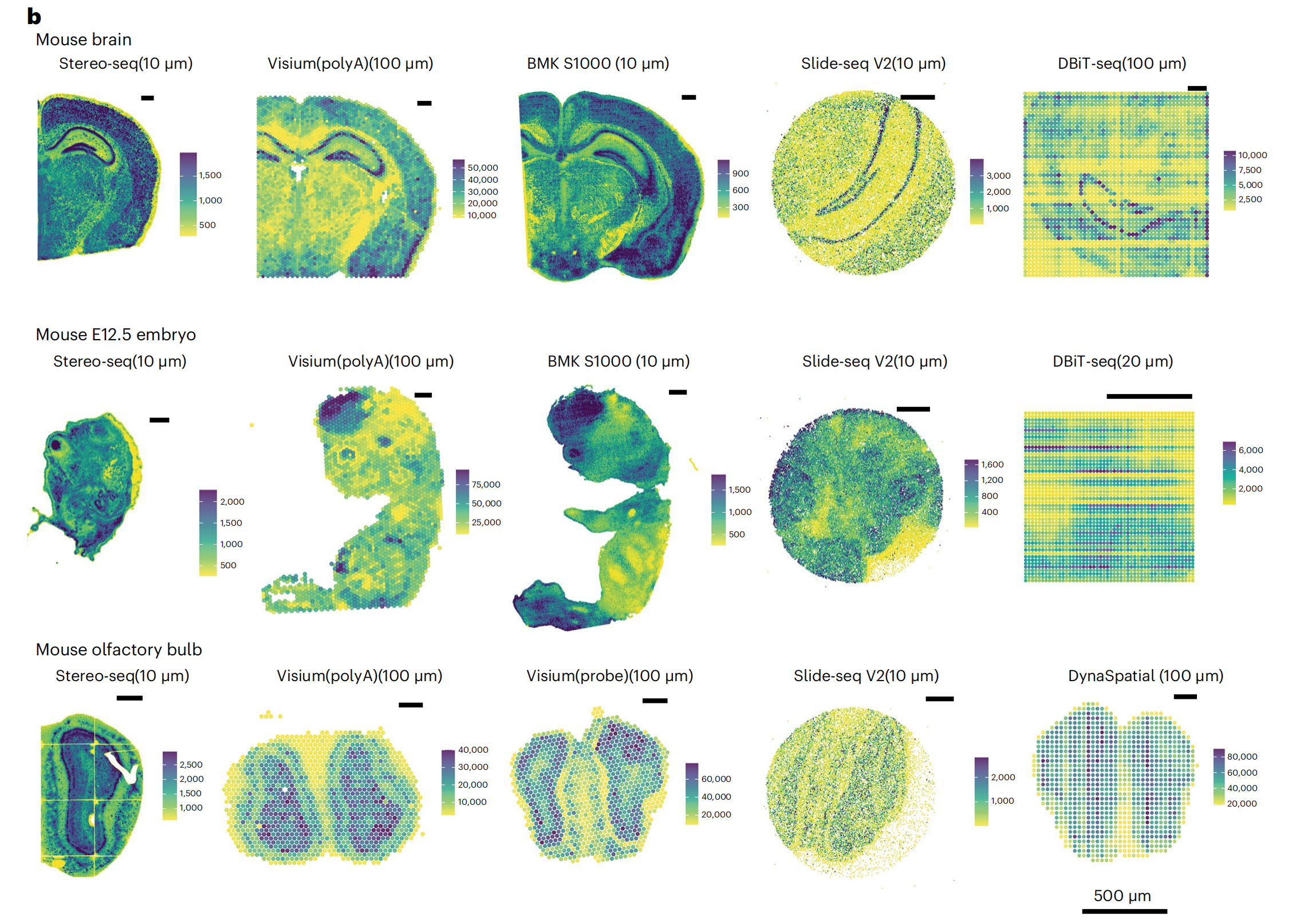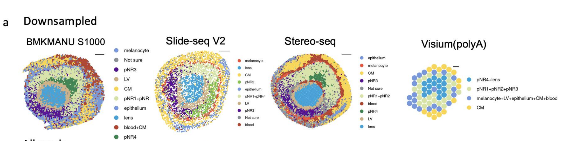 使用11種sST技術(shù),對三種組織進(jìn)行實驗,測序及分析,并對可以實現(xiàn)更高分辨率的BMKMANU S1000、Stereo-seqSlide-seqV2?在細(xì)胞級(10μm)分辨率下進(jìn)一步進(jìn)行了分析。