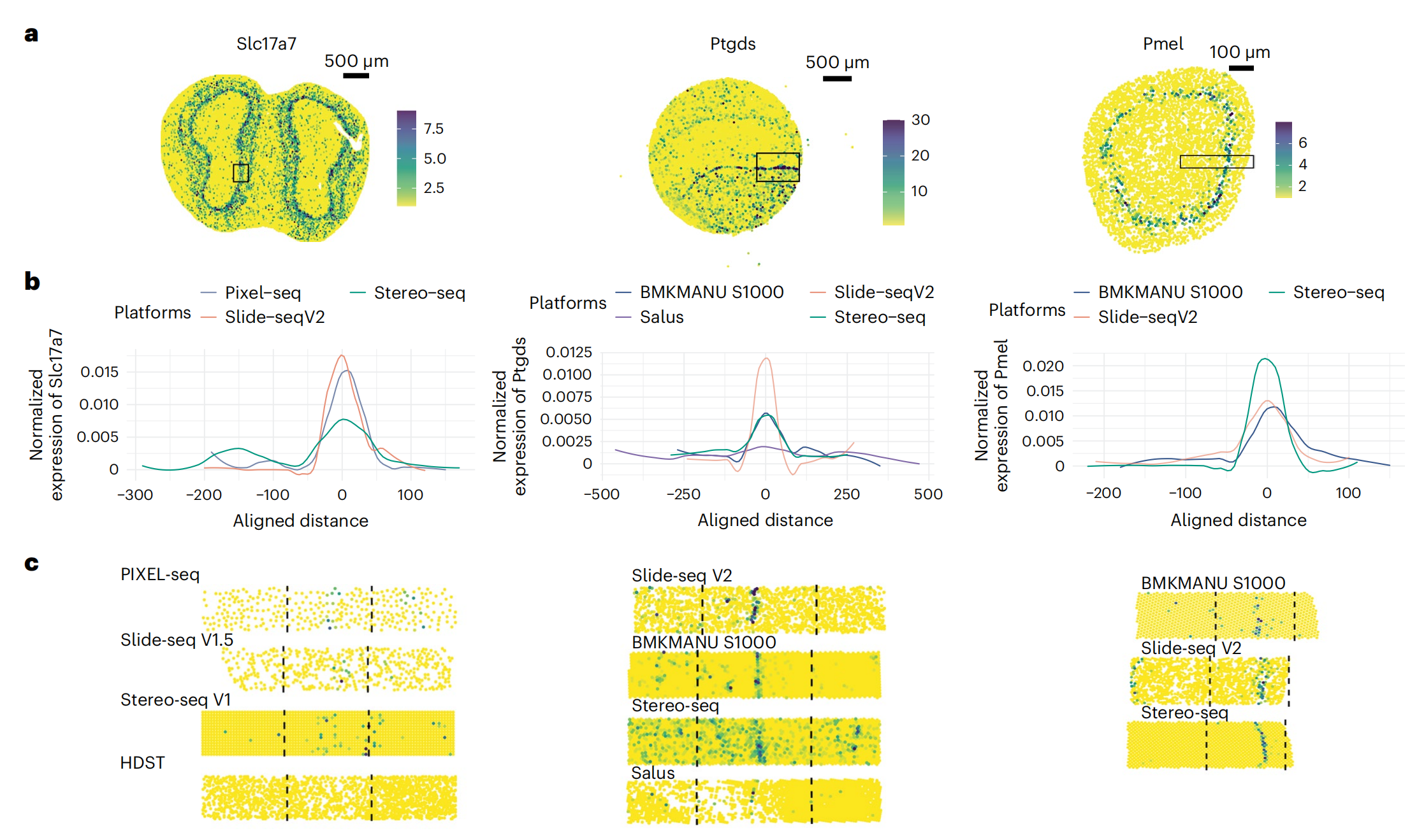 通過小鼠嗅球(Pixel-seq,Stereo-seq,Slide-seqV2),小鼠腦海馬(BMKMANU S1000,Slide-seqV2,Salus,Stereo-seq),小鼠胚胎眼球(BMKMANU S1000,Stero-seq,Slide-seqV2)經(jīng)典marker(Slc17a7、Ptgds及Pmel)的回溯來評估分子的橫向逸散問題,發(fā)現(xiàn)BMKMANU?S1000在腦海馬的表現(xiàn)優(yōu)秀,在小鼠胚胎眼球中表現(xiàn)不足,不同的技術(shù)表現(xiàn)出的差異,文中也給出了推論:可能跟樣本切片操作及組織透化等實驗存在關(guān)聯(lián),提示后續(xù)的研究者在樣本準(zhǔn)備及透化實驗應(yīng)該更加的謹(jǐn)慎。