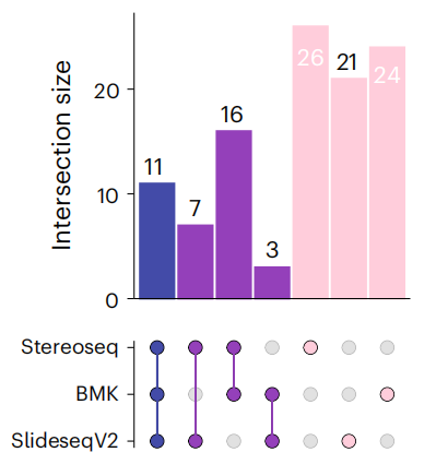 文中對visium(polyA-based)未能捕獲到的基因,在其它技術(shù)平臺中的表現(xiàn)也做了統(tǒng)計,其中BMKMANU S1000、Stereo-seqSlide-seqV2都展現(xiàn)出了統(tǒng)一且全面的基因捕獲性能。