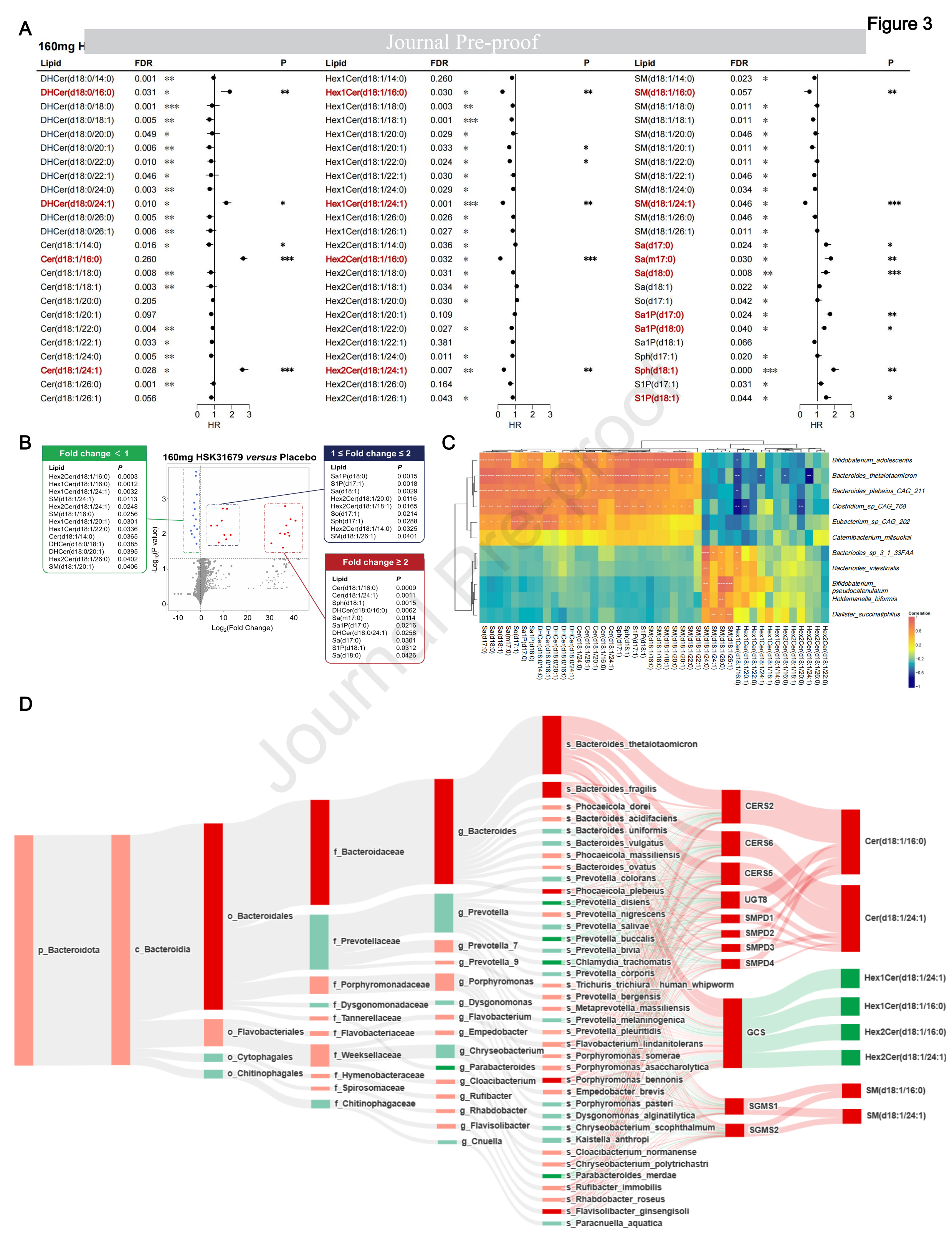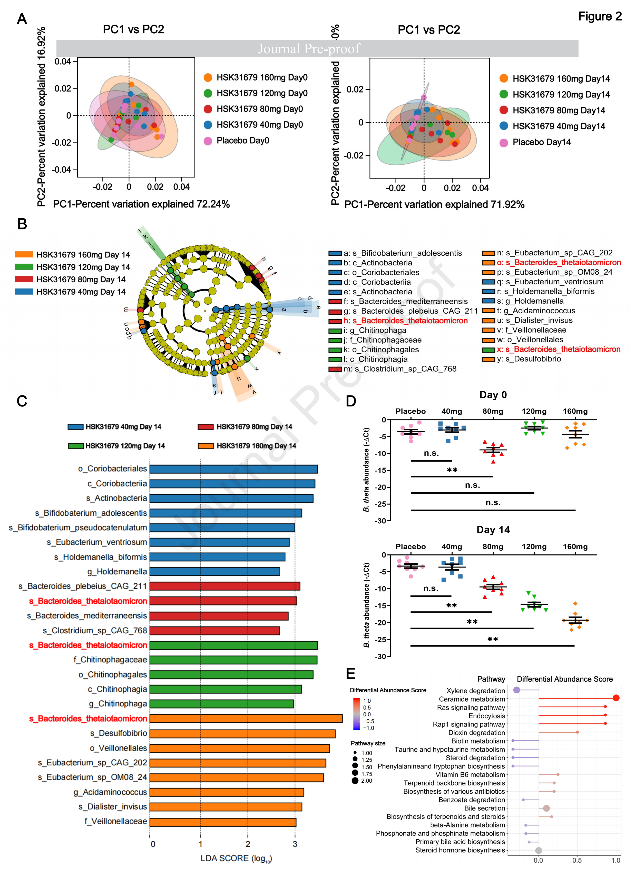 隨后通過LEfSe分析探索了HSK31679治療組14天與安慰劑組相比的腸道菌群差異,這進(jìn)一步揭示了桿菌屬的最大增量(圖2B,C)。值得注意的是,在第14天上升劑量為80mg、120mg、160mg HSK31679后,B. thetaiotaomicron的相對豐度表現(xiàn)出最明顯的逐漸上升(圖2C),并通過qPCR進(jìn)行了驗(yàn)證(圖2D),這表明B.thetaiotaomicron可能在HSK31679治療期間發(fā)揮關(guān)鍵中介作用。KEGG通路分析富集了20個(gè)信號(hào)通路的154個(gè)功能基因,其中神經(jīng)酰胺代謝被HSK31679處理激活(圖2E)。這些顯著的成分變化與以前對晚期脂肪性肝炎患者微生物種群負(fù)相關(guān)的研究一致。