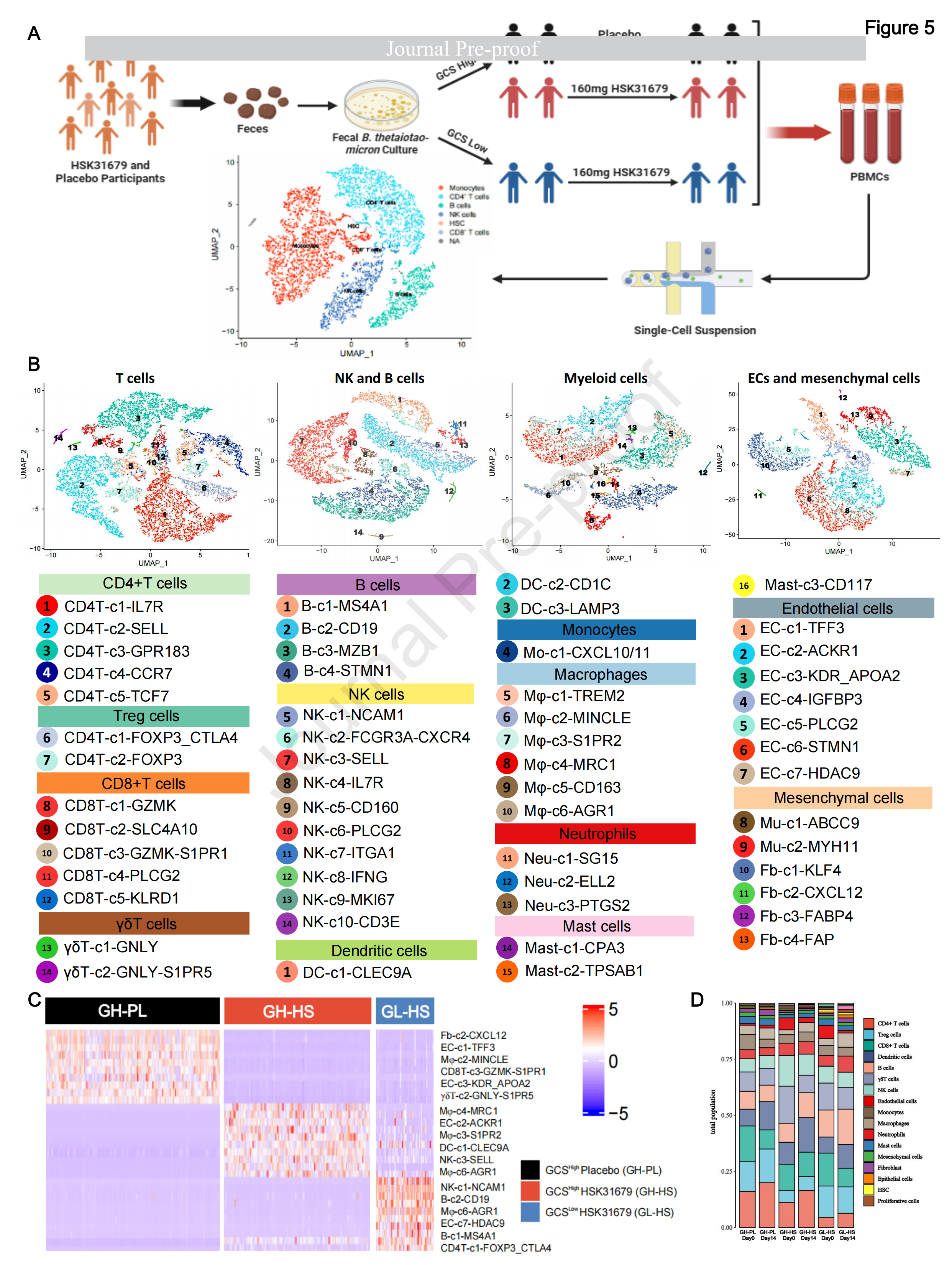 為了深入了解腸道微生物GCS在所有免疫細(xì)胞群中治療HSK31679的獨(dú)特免疫作用,研究者使用基于液滴的單細(xì)胞平臺(tái)(10×Genomics Chromium)進(jìn)行了單細(xì)胞轉(zhuǎn)錄組測序(scRNA-seq),分析了來自參與者隊(duì)列的18個(gè)外周血單核細(xì)胞(PBMC)樣本,包括3個(gè)用安慰劑(GH-PL)治療的糞便來源GCS高活性樣本、3個(gè)用160 mg HSK31679(GH-HS)治療的糞便來源GCS高活性樣本,和GCS低活性樣本(GL-HS)分別在第0天和第14天。從GH-PL、GH-HS、GL-HS數(shù)據(jù)集中獲得的128031個(gè)細(xì)胞中,共鑒定出57個(gè)細(xì)胞簇。通過SingleR v.1.0獲得的基于標(biāo)記的注釋,定義了四種主要的細(xì)胞類型:T細(xì)胞、自然殺傷細(xì)胞(NK)和B細(xì)胞、髓系細(xì)胞、內(nèi)皮細(xì)胞(EC)和間充質(zhì)細(xì)胞(圖5B)。通過計(jì)算觀察到的細(xì)胞數(shù)與預(yù)期細(xì)胞數(shù)的比值(Ro/e)來量化主要細(xì)胞團(tuán)相對不同的富集情況,發(fā)現(xiàn)髓系細(xì)胞團(tuán)構(gòu)成了GH-HS的主要改變的細(xì)胞成分,B細(xì)胞、EC團(tuán)主導(dǎo)了GL-HS樣本的細(xì)胞成分(圖5C、D和圖S8C)。鑒于如上所述,HSK31679治療通過B.thetaiotaomicron的GCS減輕了脂肪性肝炎,在隨后分析GH-HS和GL-HS之間的特定細(xì)胞區(qū)室時(shí)重點(diǎn)研究了髓系細(xì)胞。
