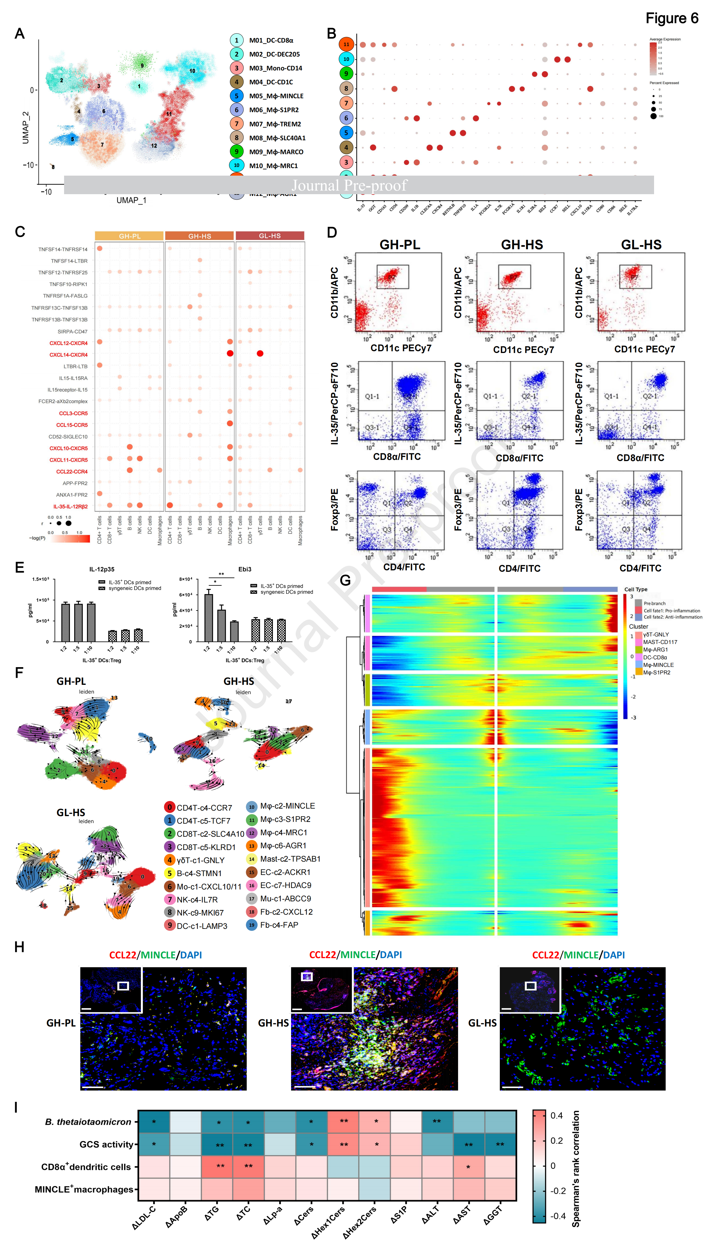 在所有髓系細(xì)胞亞群中,樹突狀細(xì)胞 (DC) 和巨噬細(xì)胞 (Mφ) 構(gòu)成了主要細(xì)胞類型(圖 5B)。通過無監(jiān)督聚類,首先關(guān)注 DCs 群體的內(nèi)在屬性和潛在功能,這些 DCs 群體被確定為減少的 CD8α+DCs(圖 6A、D)。值得注意的是,GH-HS 組中 Tregs 的 IL-12Rβ2 可以與 CD8α+DCs 衍生的 IL-35 相互作用(圖 6B、C)。如先前報(bào)道的那樣,可以增強(qiáng)炎癥過程的抑制功能。與GL-HS或GH-PL數(shù)據(jù)集相比,GH-HS的PBMCs中CD4+Foxp3+Tregs的數(shù)量增加(圖6D)。這些Tregs的抑制功能阻斷了IL-35的EBI3亞基的作用(圖6E),導(dǎo)致免疫原性顯著受損。這可能是由于STAT1/STAT3的異常激活和p38 MAPK/NF-κB信號(hào)通路的抑制(圖S8D和E)。此外,注意到DC簇的分布與γ-谷氨酰轉(zhuǎn)移酶(GGT)的表達(dá)相關(guān)(圖6B),GGT是MASH進(jìn)展的公認(rèn)血清生物標(biāo)志物。在GH-HS的所有DC中(圖6A),GGT+樣本中CD1C+DCs(cDC2)的比例顯著增加,而與GL-HS或GH-PL組相比,DEC205+DCs(cDC1)的比例降低。盡管之前的研究報(bào)告了cDCs在促進(jìn)或抑制脂肪性肝炎中的不確定作用,但結(jié)果表明,cDC1和cDC2細(xì)胞對HSK31679治療的反應(yīng)方式相反。