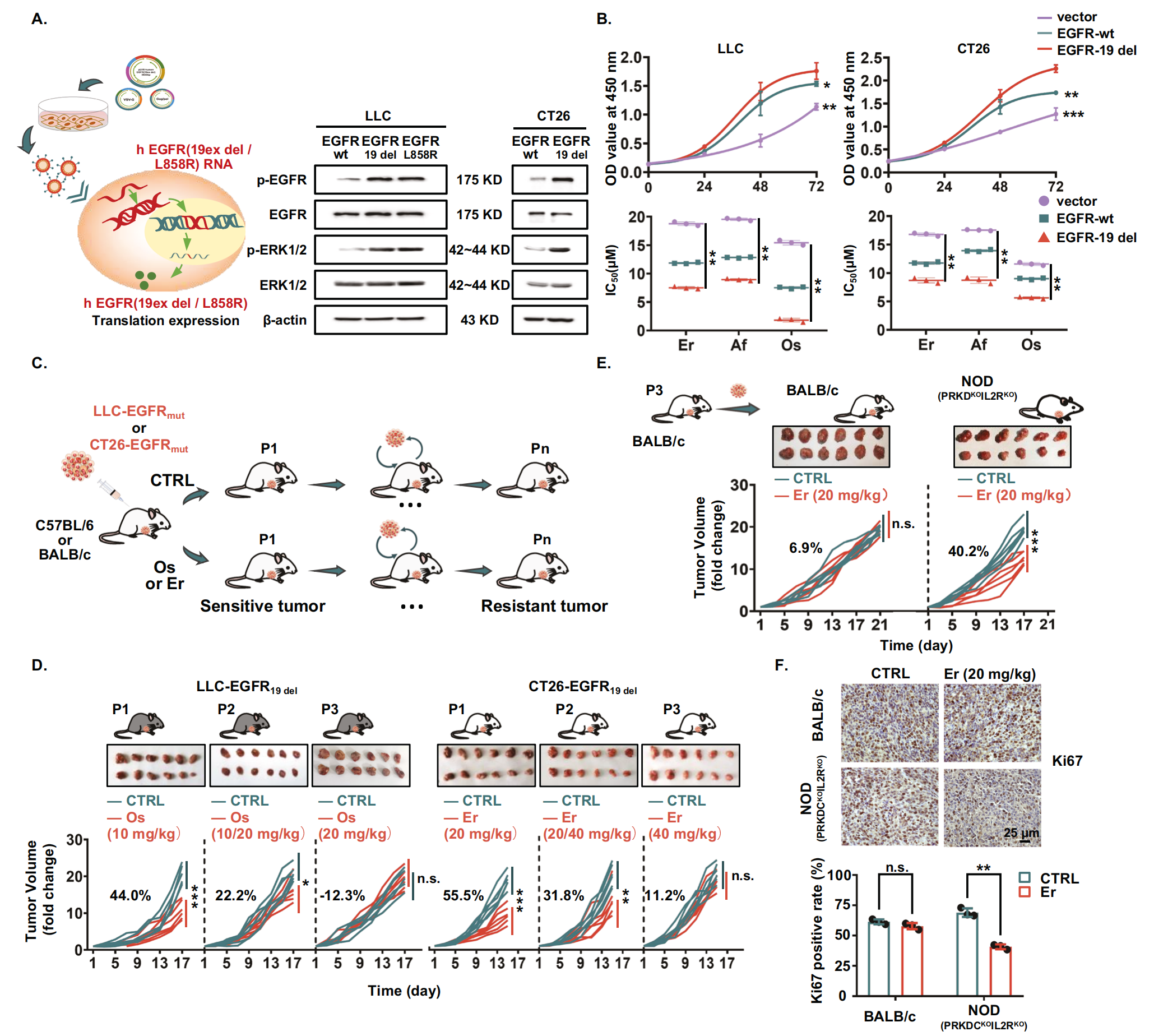 首先,該研究使用攜帶 EGFR 突變的小鼠細(xì)胞系建立了異位異種移植腫瘤模型,并評(píng)估了對(duì)不同代 EGFR-TKI 的反應(yīng)。EGFR 突變或擴(kuò)增存在于多種癌癥中,如非小細(xì)胞肺癌、結(jié)直腸癌、乳腺癌等。EGFR-TKIs 可以靶向 EGFR 敏感突變。因此,作者使用小鼠肺腺癌細(xì)胞 (LLC) 和結(jié)直腸癌細(xì)胞 (CT26) 作為工具細(xì)胞。作者用突變形式的人 EGFR 轉(zhuǎn)染小鼠細(xì)胞系 (LLC 和 CT26),攜帶外顯子 19 缺失 (EGFR19del) 或外顯子 21 L858R 錯(cuò)義突變 (EGFRL858R),這會(huì)增加 EGFR 活性,以接近細(xì)胞模型到人類疾病,建立同基因荷瘤小鼠模型。在轉(zhuǎn)染 EGFR 突變體的細(xì)胞中,p-EGFR 和 p-ERK1/2 的表達(dá)增強(qiáng),增殖速率顯著增加,表明細(xì)胞 EGFR 下游信號(hào)通路激活(圖 1A、B)。正如預(yù)期的那樣,EGFR 突變細(xì)胞對(duì)不同代 EGFR-TKI 更敏感,包括厄洛替尼、阿法替尼和奧希替尼(圖 1B)。為了全面探討 EGFR-TKIs 耐藥的機(jī)制,作者使用 EGFR 突變細(xì)胞建立了第一代和第三代 EGFR-TKIs 耐藥同基因小鼠模型(圖1C)。如圖1 D所示,第一代 (P1) LLC-EGFR19del 來源的腫瘤對(duì)奧希替尼敏感 (抑制率 = 44.0%)。在第 2 代 (P2) 中,作者將奧希替尼的劑量增加了一倍,腫瘤抑制率降低了一半 (22.2%)。用奧希替尼治療的第三代 (P3) LLC-EGFR19del衍生腫瘤被認(rèn)為對(duì)奧希替尼耐藥,因?yàn)樗鼈兊捏w積與用生理鹽水治療的小鼠的體積沒有顯著差異。同時(shí),作者還使用類似的方法成功獲得了對(duì)奧希替尼耐藥的 LLC-EGFRL858R衍生腫瘤和對(duì)厄洛替尼耐藥的 CT26-EGFR19del衍生腫瘤(圖 1D)。