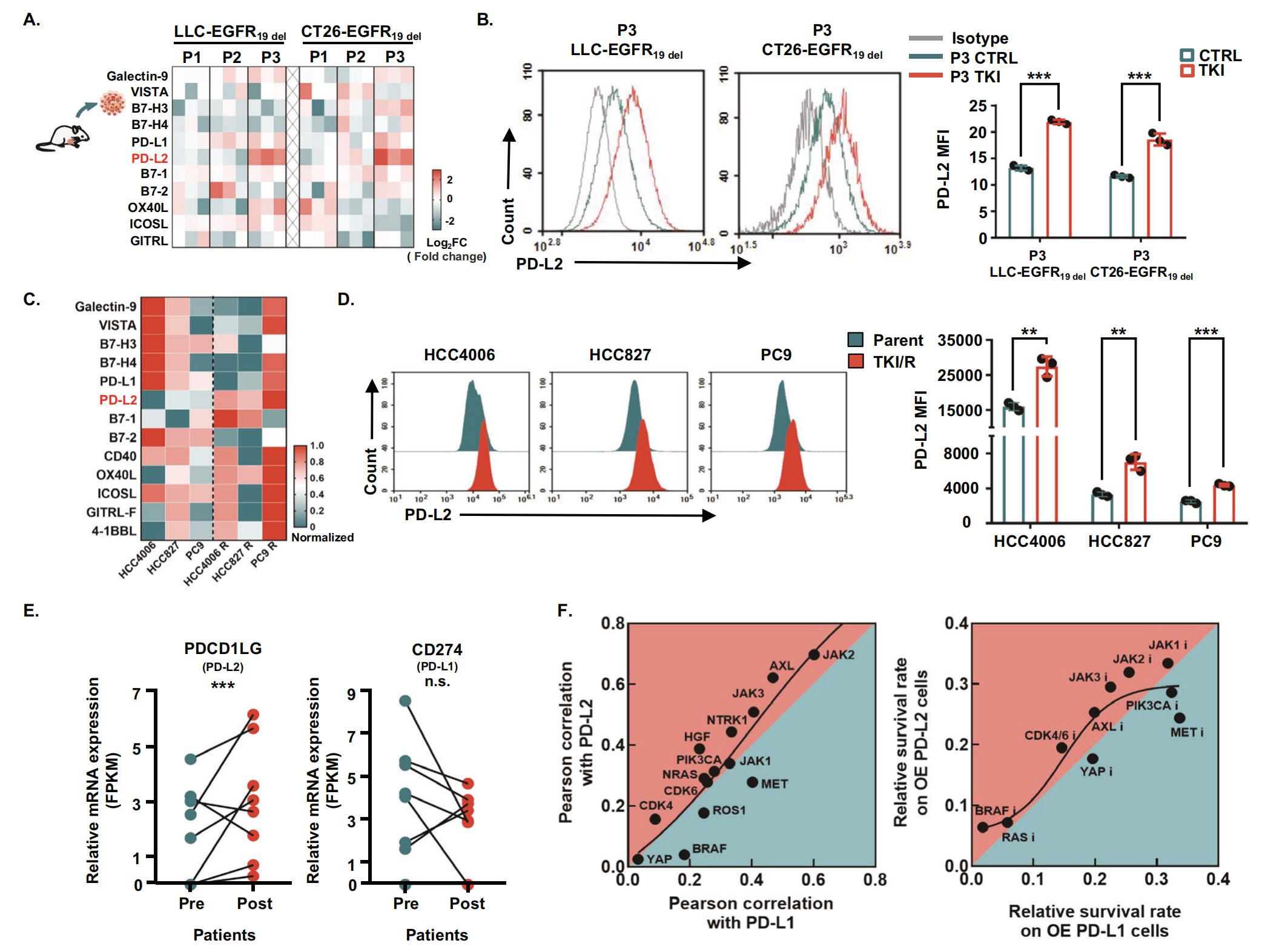 為了探索腫瘤免疫環(huán)境變化的原因,作者同時(shí)檢測了不同傳代階段腫瘤組織中刺激性和抑制性免疫調(diào)節(jié)分子的表達(dá)。在 EGFR-TKI 的初始治療中,一些抑制性免疫檢查點(diǎn)的相對(duì)表達(dá)降低(圖隨著耐藥性的出現(xiàn),抑制性免疫檢查點(diǎn)基因 PD-L1 和 PD-L2 的相對(duì)表達(dá)水平逐漸升高,尤其是 PD-L2 (圖3A)。為了進(jìn)一步驗(yàn)證 PD-L2 在 EGFR-TKI 耐藥腫瘤細(xì)胞中表達(dá)的增加,作者通過流式細(xì)胞術(shù)鑒定了 PD-L2 在 P3 腫瘤細(xì)胞厄洛替尼或奧希替尼處理的腫瘤細(xì)胞(耐藥,TKI 組)表面的表達(dá),以生理鹽水處理的細(xì)胞為對(duì)照(敏感,CTRL 組)。作者的結(jié)果表明,與對(duì)照組織相比,腫瘤細(xì)胞表面 PD-L2 的表達(dá)在耐藥腫瘤組織中表現(xiàn)出顯著增加(圖3B)。接下來,為了進(jìn)一步驗(yàn)證,作者分析了先前構(gòu)建的 EGFR 突變的 TKI 耐藥 NSCLC 細(xì)胞系 HCC4006R、HCC827R、PC9R 及其配對(duì)親本細(xì)胞中免疫檢查點(diǎn)標(biāo)志物的表達(dá)水平。在三種耐藥細(xì)胞系中,PD-L2 的 mRNA 和蛋白表達(dá)水平顯著上調(diào),而 PD-L1 的表達(dá)表現(xiàn)出不一致的變化(圖3C、D)。