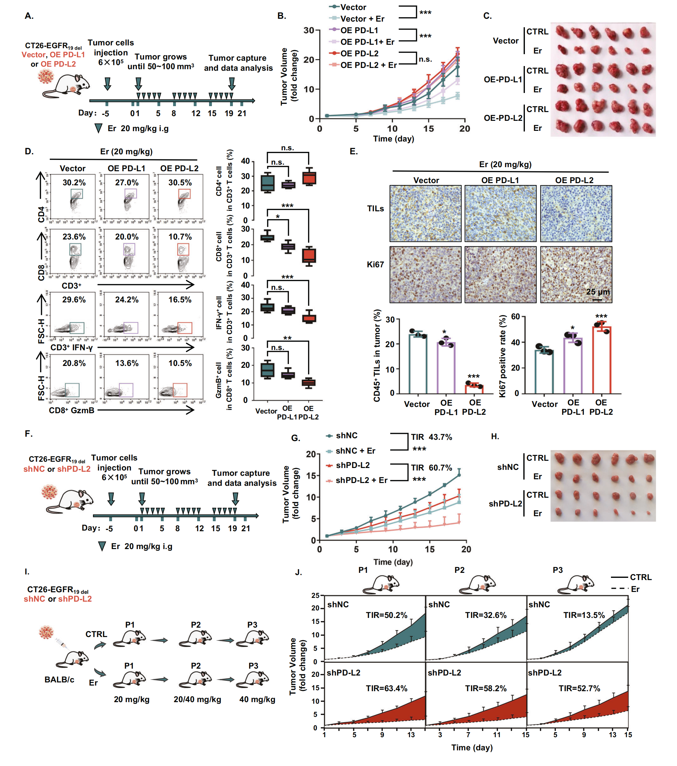 鑒于 PD-L2 在體內(nèi)調(diào)節(jié) T 細(xì)胞活性中的關(guān)鍵作用,作者通過體內(nèi)實(shí)驗(yàn)表明,PD-L2 的穩(wěn)定沉默增加了 EGFR-TKI 的敏感性(圖4F,G)。為了進(jìn)一步研究 PD-L2 如何影響對(duì) EGFR-TKI 的耐藥動(dòng)力學(xué),作者在 EGFR-TKI 耐藥同基因小鼠模型的開發(fā)中穩(wěn)定地沉默了 CT26-EGFRmut 細(xì)胞系中的 PD-L2(圖4H)。結(jié)果顯示,厄洛替尼在第一代顯著抑制 CT26-EGFR19del?衍生腫瘤的生長。重要的是,PD-L2 沉默導(dǎo)致對(duì) EGFR-TKI 治療的耐藥性延遲發(fā)生。即使在第三代 (P3) 時(shí)對(duì)照組 (CT26-EGFR19del?shNC 衍生腫瘤) 出現(xiàn)耐藥性 (腫瘤抑制率 = 13.5%),PD-L2 沉默的腫瘤對(duì) EGFR-TKIs 保持高敏感性 (腫瘤抑制率 = 52.7%) (圖4I,J)。綜上所述,作者的基因操作實(shí)驗(yàn)表明,PD-L2 通過影響腫瘤免疫微環(huán)境在介導(dǎo) EGFR-TKIs 耐藥中發(fā)揮關(guān)鍵作用。