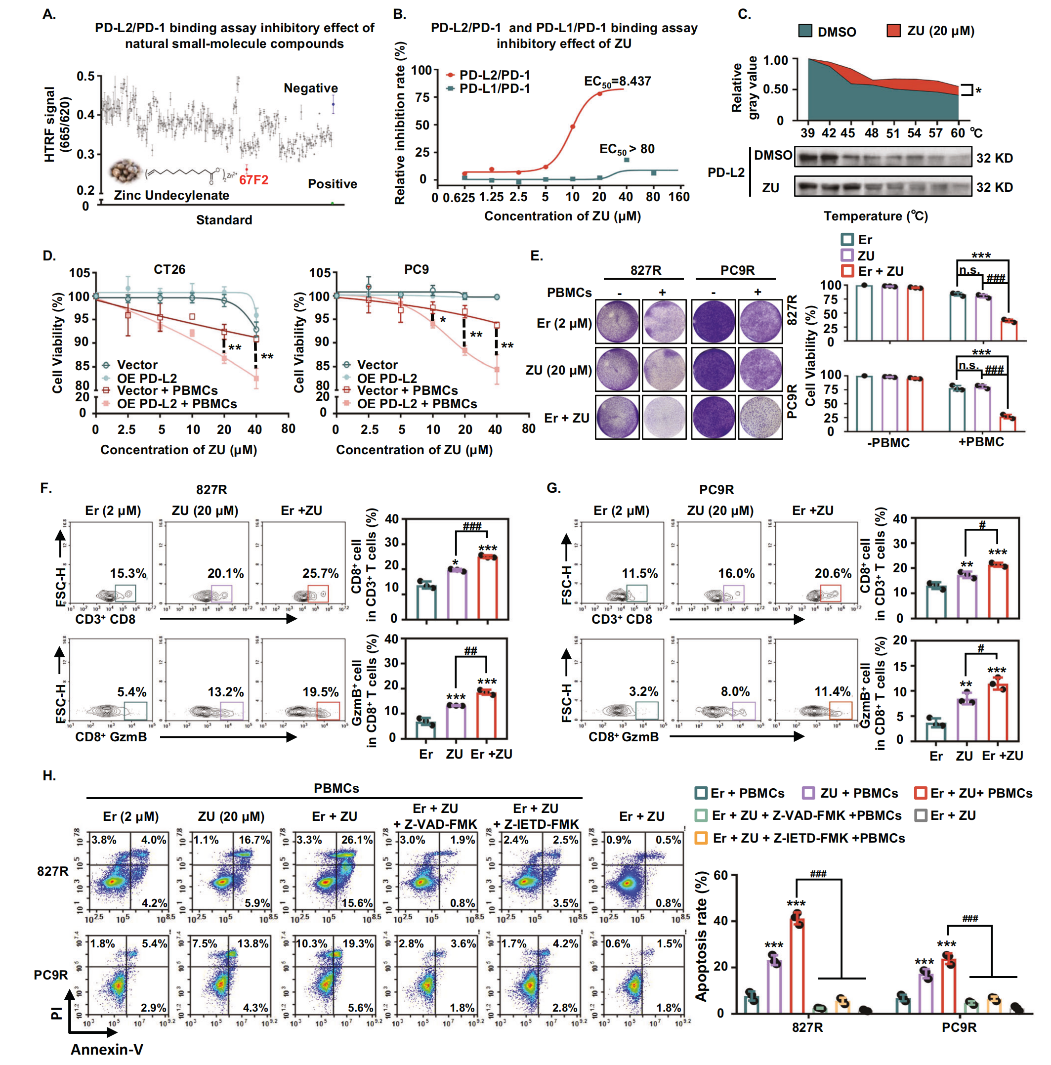 由于目前市場上沒有靶向 PD-L2 的藥物,作者使用 HTRF 技術(shù)篩選了 1300 多種天然小分子化合物的庫,以鑒定 PD-L2 的特異性抑制劑。作者發(fā)現(xiàn)了一種小分子化合物十一烯酸鋅 (ZU),它選擇性地抑制 PD-L2/PD-1 結(jié)合,EC50?8.4 μM,而 PD-L1/PD-1 為 >80 μM(圖8A, B)。ZU 是由蓖麻油通過一系列化學(xué)反應(yīng)和凈化過程生產(chǎn)的。CETSA 實(shí)驗(yàn)表明,與 PD-L1/PD-1 相比,ZU 有效抑制了 PD-L2 與 PD-1 的結(jié)合(圖8C)。這些結(jié)果表明 ZU 具有阻斷 PD-L2/PD-1 相互作用的特異性能力。此外,作者利用空載體或 PD-L2 過表達(dá)的小鼠 CT26 細(xì)胞來驗(yàn)證 ZU 的體外抗腫瘤作用。在 40 μM 濃度下,ZU 不會(huì)顯著降低 CT26 空載體和 PD-L2 過表達(dá)細(xì)胞的活力(圖8D),這表明 ZU 沒有直接的細(xì)胞毒性作用。然而,當(dāng)腫瘤細(xì)胞與活化的 T 細(xì)胞共培養(yǎng)時(shí),與 CT26 空載體細(xì)胞相比,ZU (40 μM) 顯著抑制了 CT26 PD-L2 過表達(dá)細(xì)胞的活力(圖8D)。這表明 ZU 通過靶向 PD-L2/PD-1 的免疫調(diào)節(jié)發(fā)揮抗腫瘤作用。使用具有空載體和 PD-L2 過表達(dá)的 PC9 細(xì)胞獲得了類似的結(jié)果(圖8D)。此外,作者研究了 ZU 和 EGFR-TKI 對(duì)親本和 TKI 耐藥 NSCLC 細(xì)胞的聯(lián)合抑制作用。對(duì)于耐藥細(xì)胞,結(jié)果表明,厄洛替尼聯(lián)合 ZU 對(duì) 827 R 或 PC9R 細(xì)胞的生長抑制具有協(xié)同作用,與單獨(dú)使用厄洛替尼相比,耐藥細(xì)胞的存活率顯著降低(圖8E)。重要的是,在沒有活化的 T 細(xì)胞的情況下,厄洛替尼聯(lián)合 ZU 的細(xì)胞殺傷效果沒有顯著差異(圖8E)。上述結(jié)果進(jìn)一步表明,靶向 PD-L2 的 ZU 與 EGFR-TKI 的組合對(duì)耐藥腫瘤表現(xiàn)出協(xié)同抑制作用。