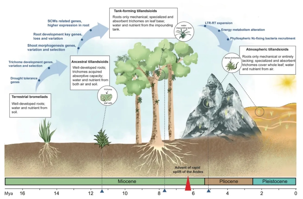 為了追溯空氣鳳梨的起源,研究人員廣泛收集了覆蓋空氣鳳梨亞科(Tillandsioideae)78%屬的植物,利用轉(zhuǎn)錄組測序獲得低拷貝基因的91個(gè)核基因,構(gòu)建了空氣鳳梨亞科植物系統(tǒng)發(fā)育樹(圖1)。然后通過祖先重建和分子鐘計(jì)算,發(fā)現(xiàn)核心空氣鳳梨亞科植物起源于11.3百萬年前的安第斯山脈,祖先類型為積水型鳳梨(圖2a)。大約在6百萬年前,安第斯山脈快速隆起,推動(dòng)了物種的分化,完全大氣生的空氣鳳梨出現(xiàn),這些植物通常被稱為“air plants”。地球氣候世代的轉(zhuǎn)變也加速了物種的分化(圖2b-c)。