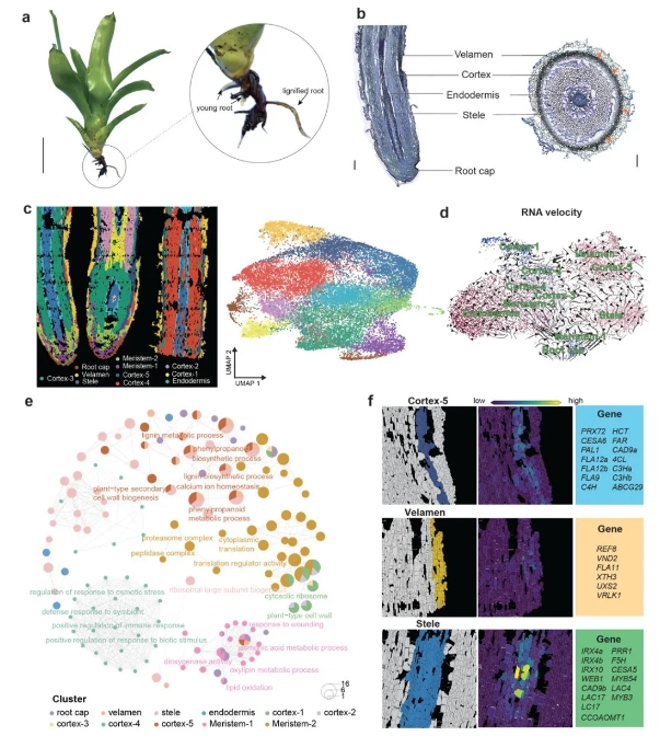空氣鳳梨的根部功能顯著退化,主要僅發(fā)揮機(jī)械“固著”作用或完全缺失。通過基因組和比較基因組分析(圖3a-e),研究人員發(fā)現(xiàn)與根發(fā)育相關(guān)的關(guān)鍵基因(如SCR、WER、TTG1、JKD)在附生鳳梨類群中發(fā)生了快速進(jìn)化,并受到選擇固定(圖3i-j)。與側(cè)根發(fā)育相關(guān)的AR1基因家族則出現(xiàn)顯著收縮。與根系響應(yīng)重力的關(guān)鍵基因ARG1丟失,而負(fù)調(diào)控基因WG2則受到正向選擇。同時(shí),根系對(duì)水分響應(yīng)的關(guān)鍵基因EN1也發(fā)生喪失。這些結(jié)果表明,空氣植物的進(jìn)化適應(yīng)增強(qiáng)了它們?cè)诖髿馍鷳B(tài)位中的生存能力。此外,利用相同的方法,研究人員還找到了空氣鳳梨耐旱的基因組適應(yīng)性進(jìn)化的關(guān)鍵基因(圖3f-g)和積水類型鳳梨蓄水槽形成的關(guān)鍵基因AS1的變異選擇(圖3h)。此外,研究人員通過空間轉(zhuǎn)錄組分析發(fā)現(xiàn),與次生細(xì)胞壁合成相關(guān)的多個(gè)基因在根被和皮層組織中表現(xiàn)出快速表達(dá),為根系在生長過程中迅速木質(zhì)化并發(fā)揮機(jī)械“固著”作用提供了分子基礎(chǔ)(圖4)。