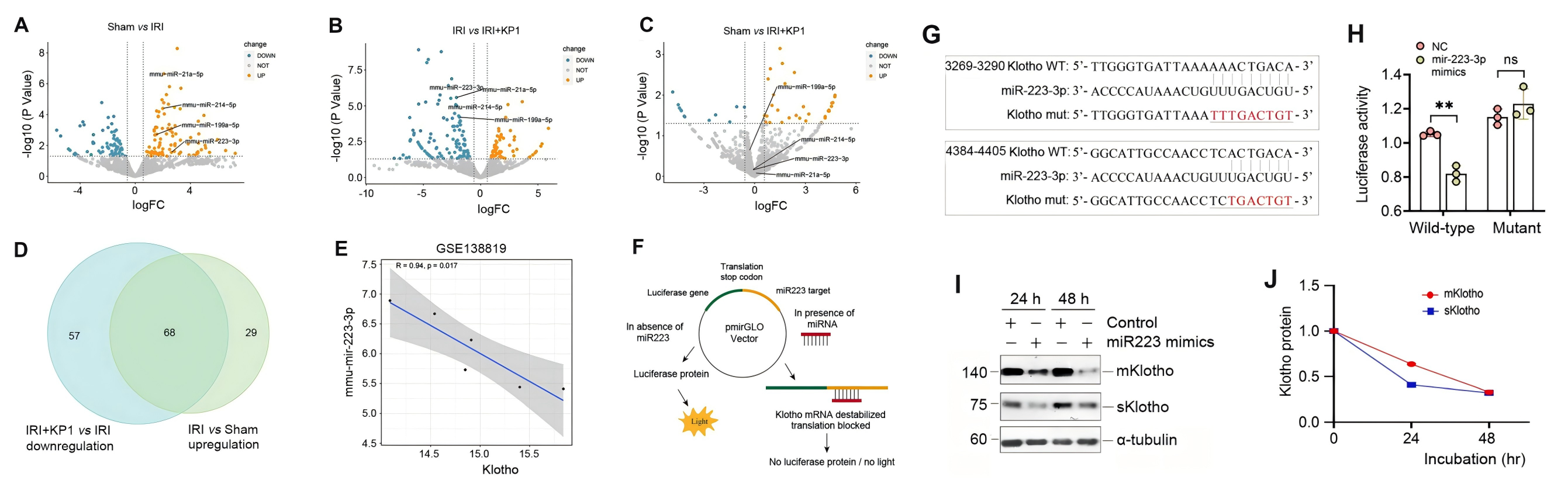 由于 KP1 不影響 Klotho mRNA 水平和蛋白質(zhì)穩(wěn)定性,作者開始探索 KP1 是否通過miRNA調(diào)節(jié) Klotho 蛋白,在 UIRI 腎臟中鑒定到了68個上調(diào)miRNA,在注射 KP1 后恢復(fù)到基線,其中 10 個與 Klotho mRNA 的 3′-UTR 特異性結(jié)合,其中miR-223-3p表現(xiàn)非常明顯,且在對公共轉(zhuǎn)錄組數(shù)據(jù)集分析后發(fā)現(xiàn),miR-223-3p 與 Klotho 水平呈負(fù)相關(guān),支持了 miR-223-3p 與 Klotho 調(diào)節(jié)的相關(guān)性。