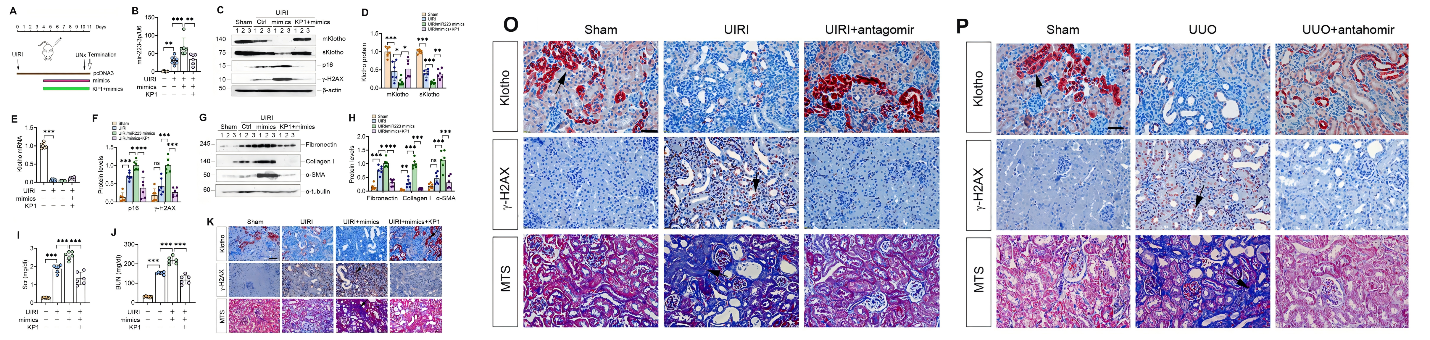 為了證實(shí) miR-223-3p 在 Klotho 表達(dá)中的調(diào)節(jié)作用,作者進(jìn)行了雙熒光素酶報告基因測定,轉(zhuǎn)染 miR-223-3p 模擬物降低了含有野生型未突變型 Klotho mRNA 序列的報告基因的熒光素酶活性,表明 miR-223-3p 可以特異性靶向 Klotho mRNA,抑制其活性,用miR-223-3p轉(zhuǎn)染HK-2細(xì)胞進(jìn)一步證明miR-223-3p抑制 HK-2 細(xì)胞中 Klotho 蛋白的表達(dá)。體內(nèi)模型原位雜交驗(yàn)證了miR-223-3p 在 UIRI 腎腎小管上皮中被誘導(dǎo),而KP1抑制了miR-223-3p表達(dá),結(jié)合免疫熒光染色結(jié)果證明了KP1 可以通過在體內(nèi)抑制 miR-223-3p 來恢復(fù) Klotho 表達(dá),在體外的HK-2 細(xì)胞中的miR-223-3p及其拮抗劑轉(zhuǎn)染實(shí)驗(yàn)也呈現(xiàn)出了相同的結(jié)果。