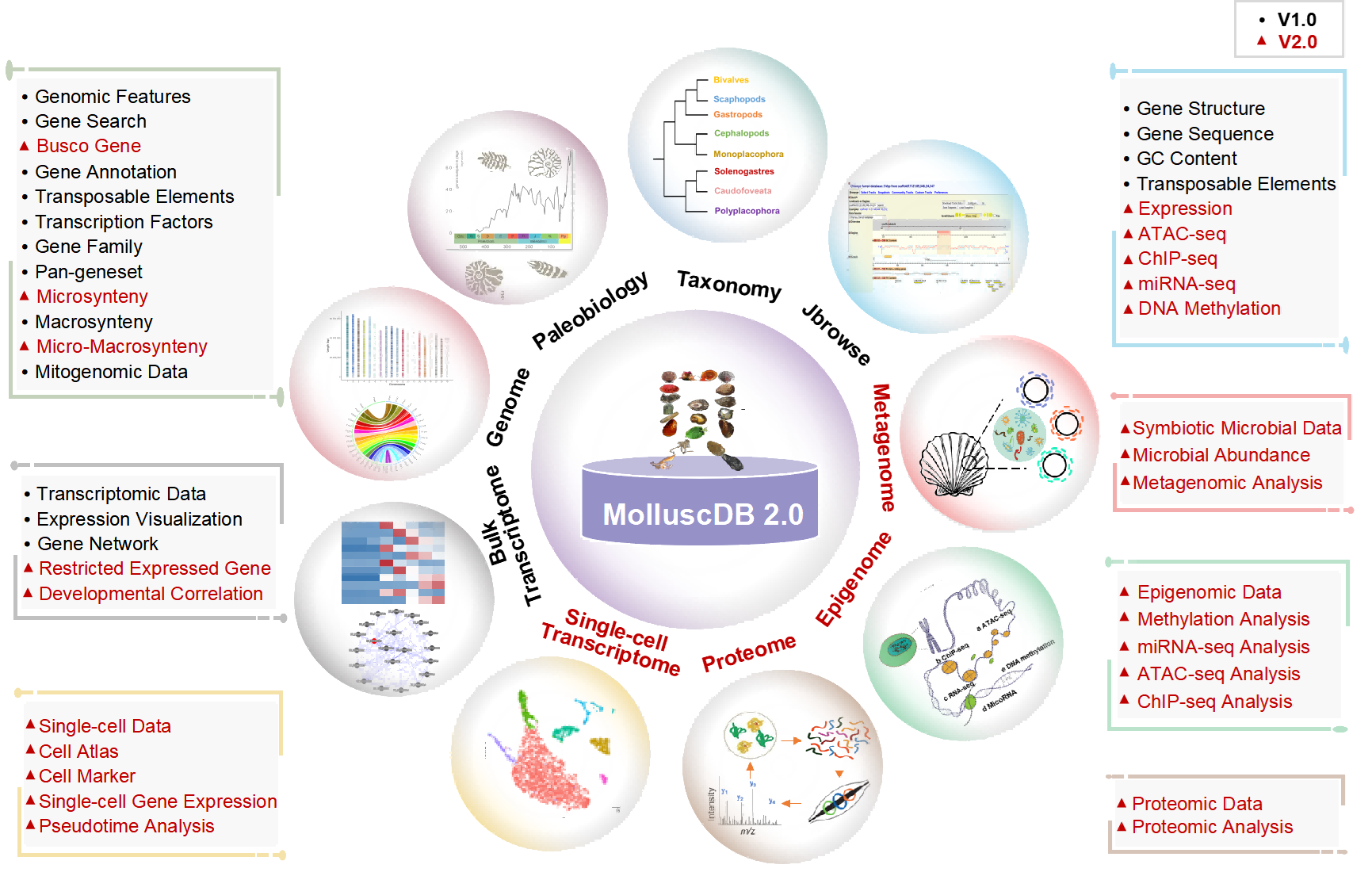 圖3-MolluscDB 2.0數(shù)據(jù)庫(kù)架構(gòu)和多組學(xué)功能模塊概覽