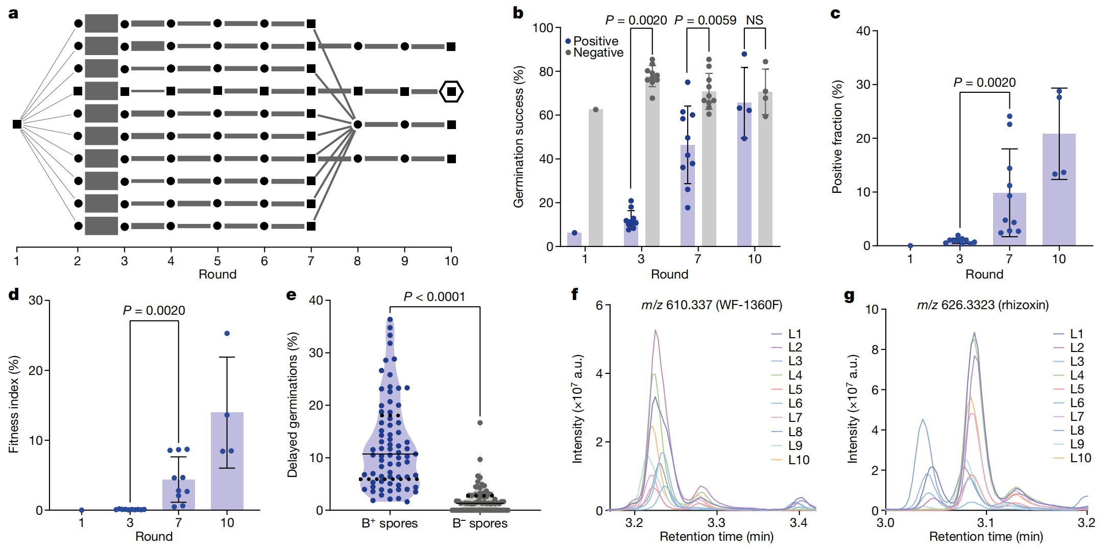 為進一步提高人工誘導的NH-根霉生菌內(nèi)共生體系的遺傳穩(wěn)定性,進行多輪生長和篩選,以施加正向選擇壓力。隨著進化過程的進行,攜帶細菌的孢子的萌發(fā)率逐漸提高,并且攜帶細菌的孢子的比例也顯著增加,而真菌也在適應性進化過程中發(fā)生了基因突變,這些突變可能與內(nèi)吞作用有關,這與共生關系的穩(wěn)定性和適應性的提高相一致。需要注意的是,由于真菌基因組研究不足,且存在潛在的表觀遺傳效應,這些推測仍需進一步驗證。在適應性進化后的共生關系中,M. rhizoxinica?能在新的宿主菌株 NH 中能夠產(chǎn)生次級代謝產(chǎn)物 WF-1360F,而根霉菌株 NH 能夠?qū)?WF-1360F 轉(zhuǎn)化為 rhizoxin。這表明,通過誘導內(nèi)共生可以將新的代謝功能轉(zhuǎn)移到宿主中。