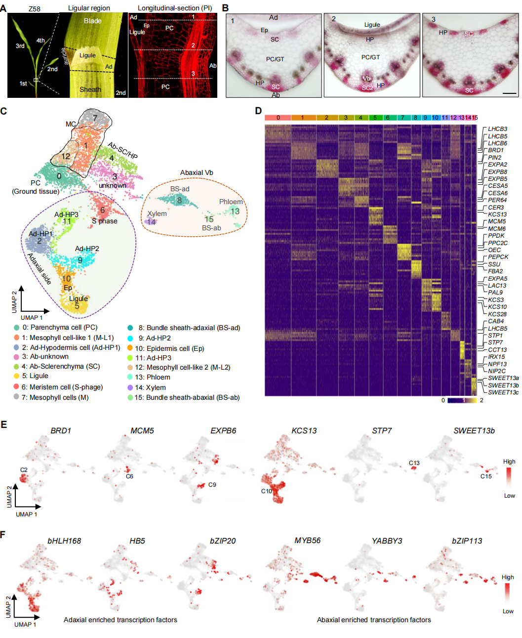 葉片角度(Leaf Angle, LA)是影響玉米種植密度和產量的關鍵因素。然而,調控葉片角度形成的機制尚不清楚。該研究通過對不同玉米自交系的莖葉枕區(qū)域進行比較組織學分析,發(fā)現(xiàn)葉片角度大小顯著受到莖葉枕上表皮韌皮纖維細胞(SC)的初始伸長和隨后的木質化的影響。通過批量和單細胞核RNA測序,生成了莖葉枕區(qū)域的全面轉錄組圖譜,并鑒定了許多可能影響其特化為SC的下皮細胞富集基因。