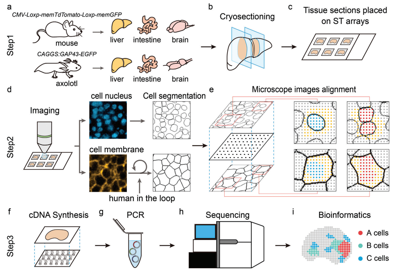 該研究提出了一種新的細胞邊界定義方法:利用基因編碼的熒光蛋白對細胞膜進行標記,從而能夠在組織切片上精確定位細胞內的測序位點和轉錄本。與基于細胞核的方法相比,這種基于細胞膜的方法顯著增加了捕獲的基因數(shù)量,小鼠和墨西哥鈍口螈肝臟中基因數(shù)量分別增加了67%和119%。
