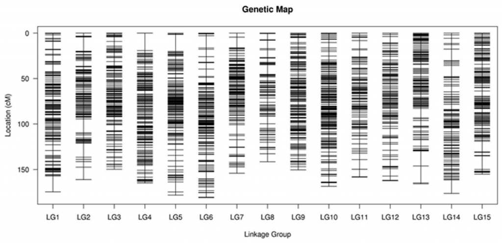 甘薯作為一個(gè)全球重要的作物,其含有豐富的營(yíng)養(yǎng)成分以及對(duì)不同環(huán)境的適應(yīng)能力。然而,由于其自交不親和,高雜合度等特性,使其遺傳特征的研究相對(duì)較少。作者從Xin24×Yushu10雜交中選擇212個(gè)F1材料,SLAF-seq測(cè)序,獲得親本26.73×,子代52.25×的測(cè)序數(shù)據(jù),依據(jù)SNP及百邁客生物自主研發(fā)的HighMap構(gòu)圖軟件,生成一個(gè)長(zhǎng)度為2441.56 cM、平均圖距為0.51 cM的遺傳圖譜。