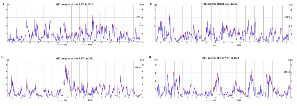 實(shí)驗(yàn)方法:Xin24×Yushu10雜交中選擇212個(gè)F1材料: 特異性位點(diǎn)擴(kuò)增片段測(cè)序(SLAF-seq);遺傳圖譜構(gòu)建;數(shù)量性狀位點(diǎn)(QTL)定位;GWAS關(guān)聯(lián)(F1群體)
