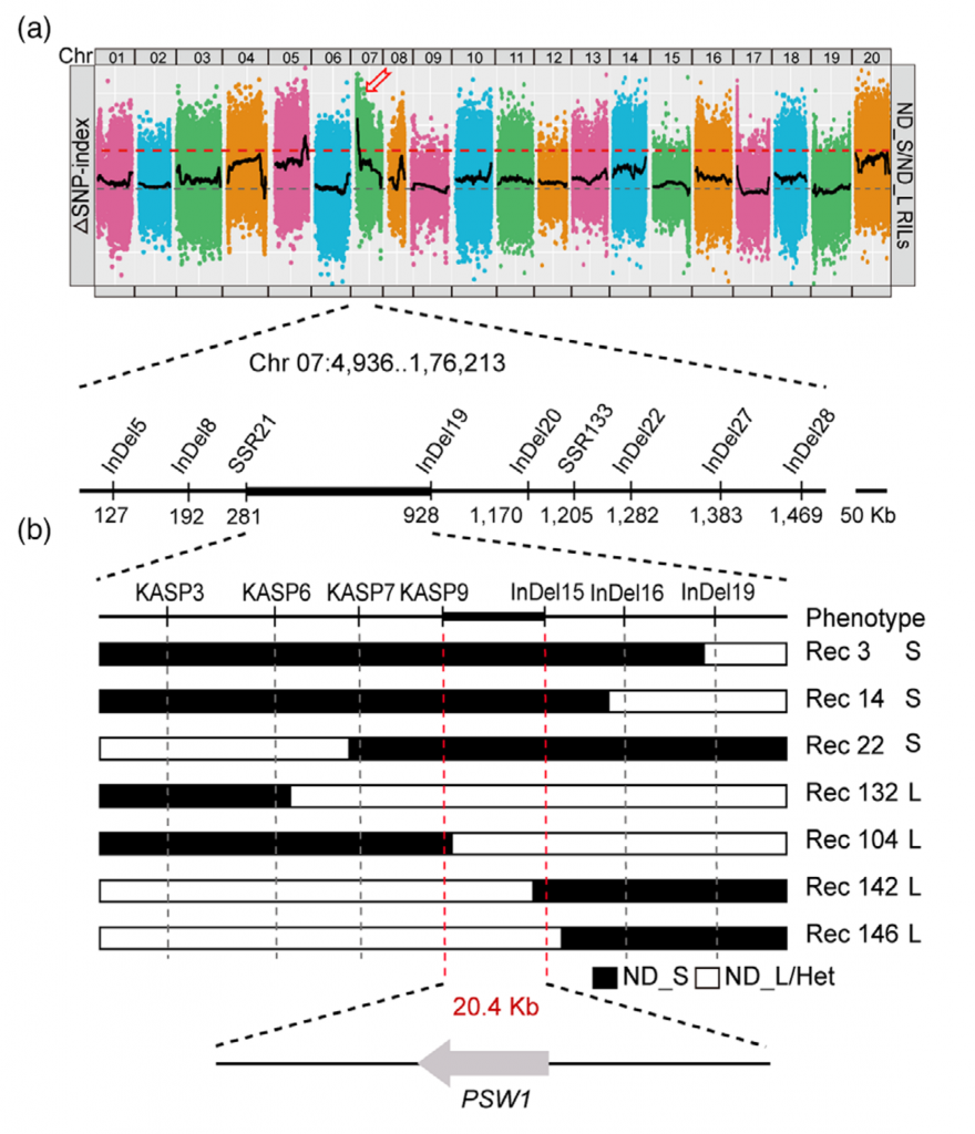 花生莢果大小是決定花生產(chǎn)量的關(guān)鍵農(nóng)藝性狀,為了鑒定控制花生莢果大小的基因,該研究對(duì)188份核心種質(zhì)進(jìn)行鑒定,并選取莢果大小/重量差異顯著的2份花生材料構(gòu)建F2群體,BSA-Seq獲得了288.58 Gb的原始數(shù)據(jù)。利用285914個(gè)高質(zhì)量SNPs 和70 759個(gè) InDel,將控制莢果大小的基因定位在07染色體1.17 Mb的區(qū)間內(nèi)。作者從F6:7和F6:8群體中開發(fā)了15個(gè)多態(tài)性標(biāo)記并對(duì)個(gè)體進(jìn)行基因分型,精細(xì)定位QTL到KASP 9 和In Del15之間20.4 kb的區(qū)間內(nèi)。該區(qū)間僅包含1個(gè)預(yù)測(cè)的非同義突變基因和InDels,將該基因命名為PSW1。