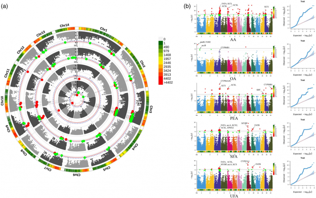 鎖定油脂合成關(guān)鍵位點:通過全基因組關(guān)聯(lián)分析(GWAS),團隊識別出影響種仁油脂組成的多個關(guān)鍵基因(如ACSL、FAD2、FAB2等),為高品質(zhì)油料品種的選育提供了精準靶點。