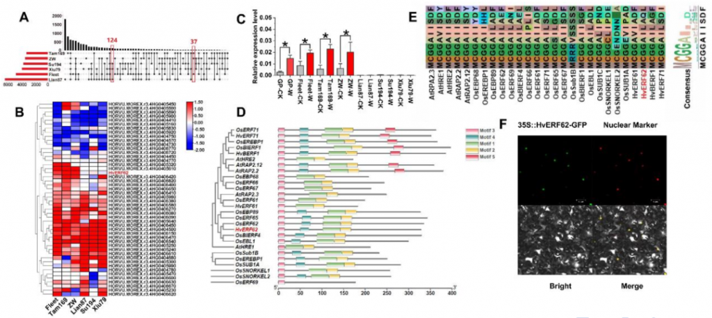 對3個耐漬澇材料(Fleet、Tam169、ZW)和3個漬澇敏感材料(Lian87、Su194、Xiu79)進(jìn)行轉(zhuǎn)錄組測序(RNA-seq)分析。通過比較不同材料在正常和漬澇條件下的基因表達(dá)差異,發(fā)現(xiàn)在3個耐漬澇材料中,位于4H染色體QTL區(qū)間內(nèi)的 HvERF62 基因受漬澇脅迫顯著誘導(dǎo)表達(dá),而在3個漬澇敏感材料中,該基因表達(dá)量較低(圖3B, 3C)。