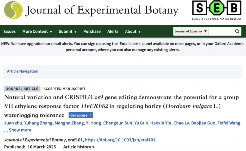 揚州大學(xué)Rugen Xu團(tuán)隊在《Journal of Experimental Botany》雜志發(fā)表題為“Natural variation and CRISPR/Cas9 gene editing demonstrate the potential for a group VII ethylene response factor HvERF62 in regulating barley (Hordeum vulgare L.) waterlogging tolerance”的論文,揭示了大麥VII類乙烯反應(yīng)因子?HvERF62?通過調(diào)控氣孔形成、活性氧穩(wěn)態(tài)和碳水化合物積累,從而提高大麥耐漬澇能力。